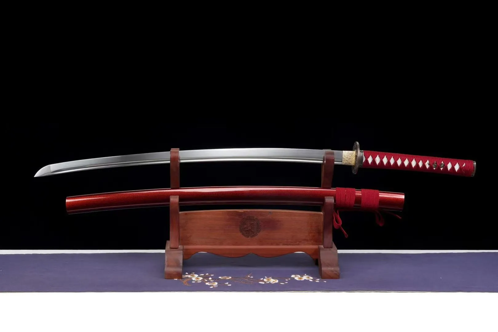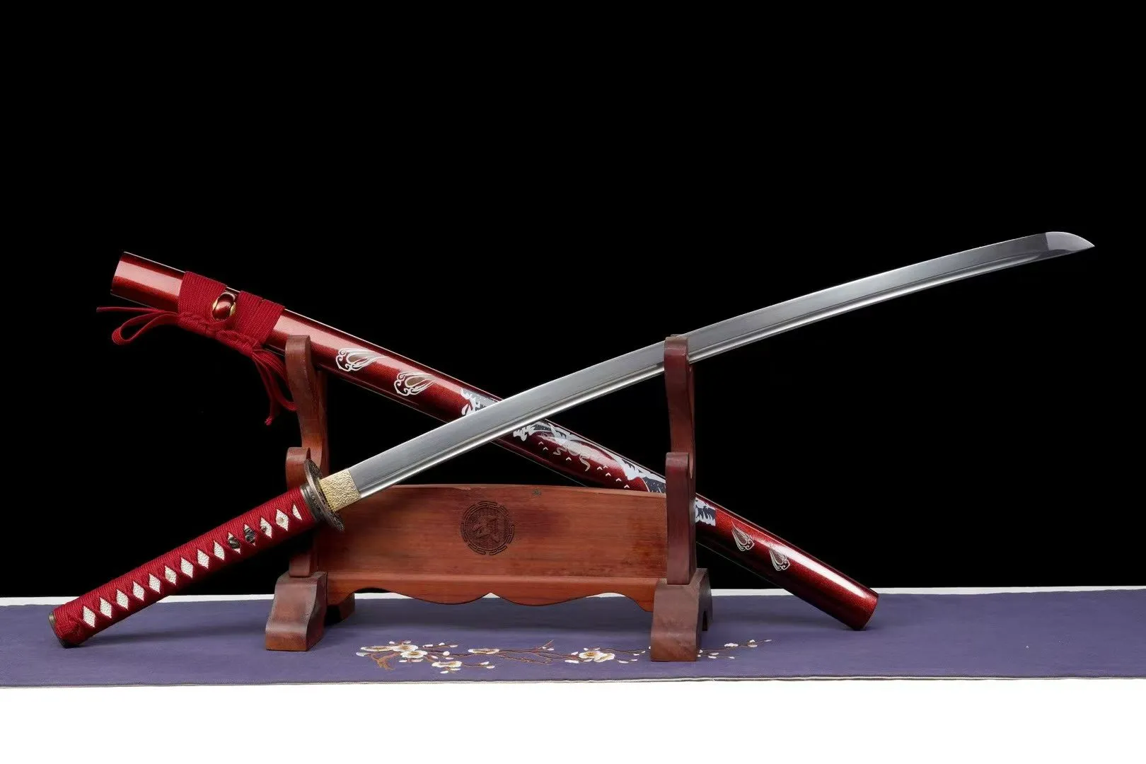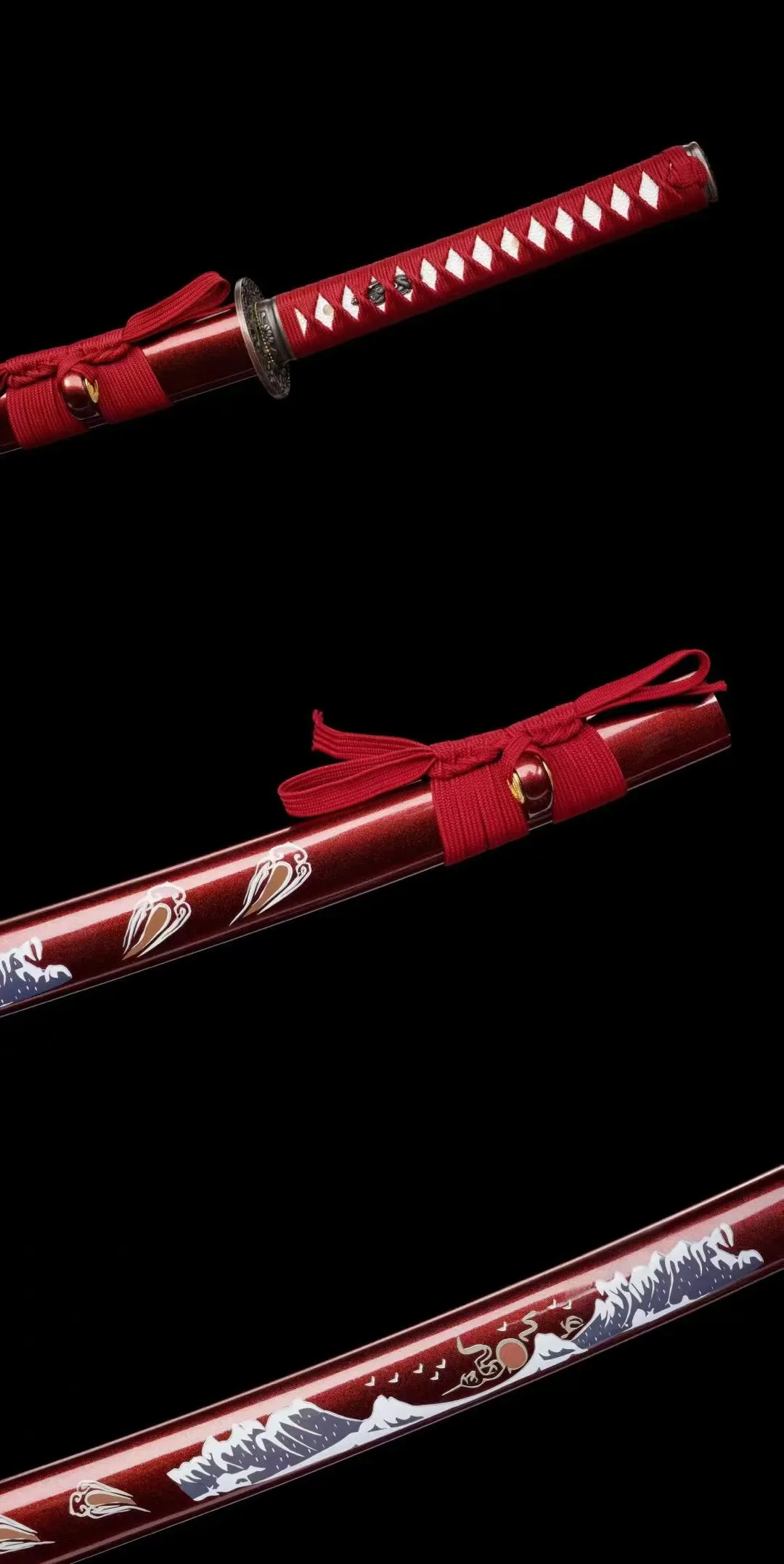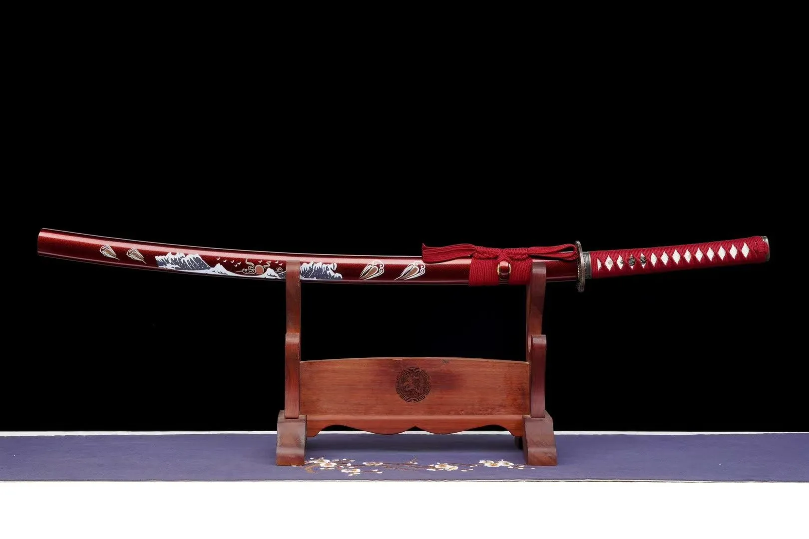 Thanh katana mang phong cách trang trí nổi bật với tông đỏ chủ đạo, kết hợp họa tiết sóng và hoa trên vỏ kiếm, phù hợp cho sưu tầm hoặc trưng bày không gian. Thiết kế tổng thể cân đối, mang hơi hướng truyền thống Nhật Bản nhưng nhấn mạnh tính thẩm mỹ hiện đại.
