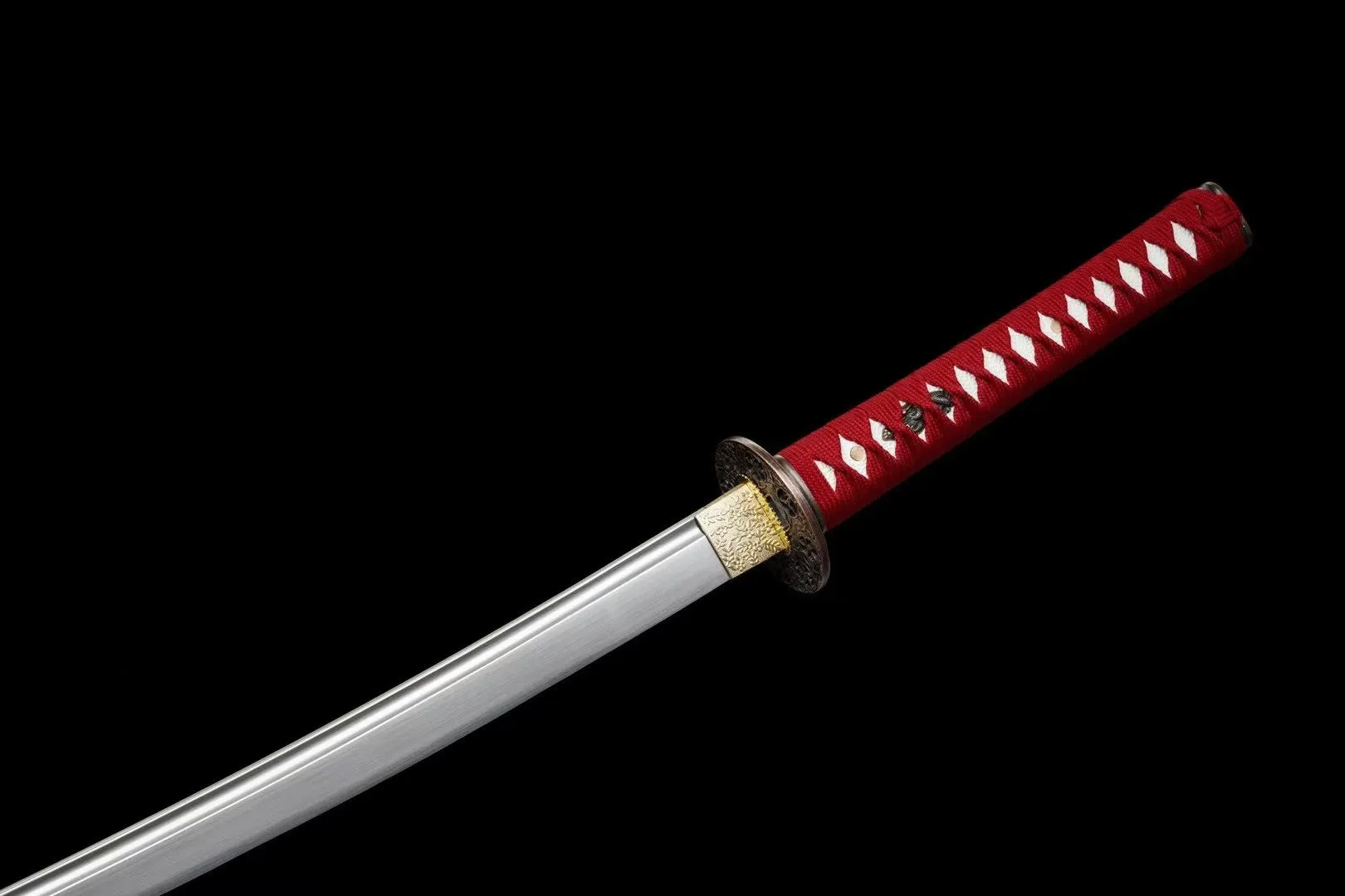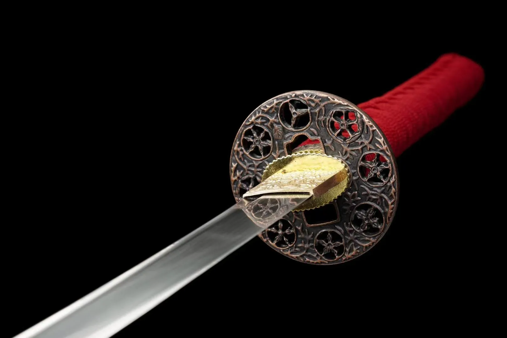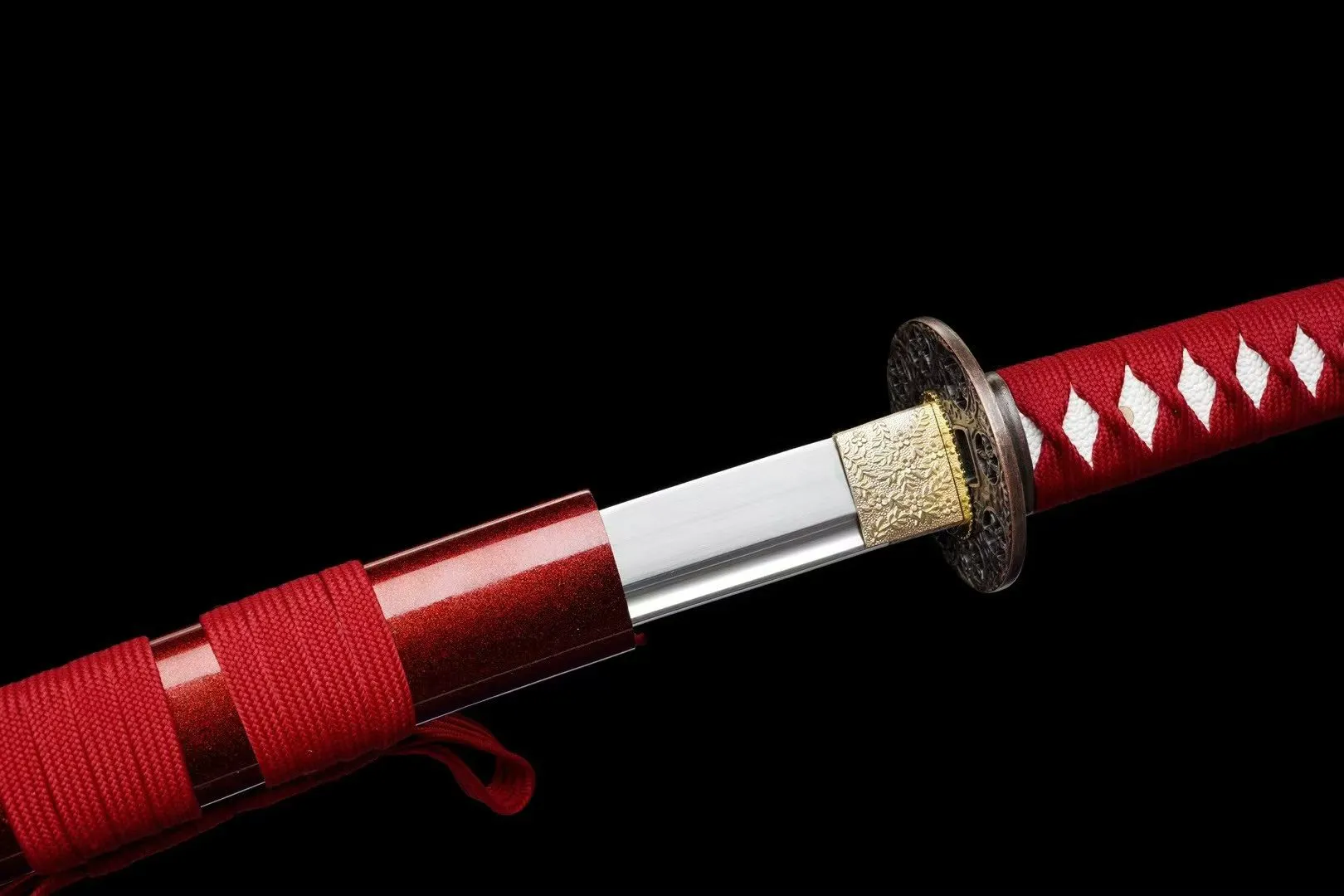 Phần tay cầm katana dài 26 cm, quấn dây đỏ kết hợp giả da cá, tạo độ bám tốt. Tsuba hợp kim chạm khắc họa tiết cổ điển, đi kèm habaki hoàn thiện màu vàng nổi bật. Saya gỗ sơn mài phủ họa tiết hoa văn, đi kèm dây buộc đồng màu.