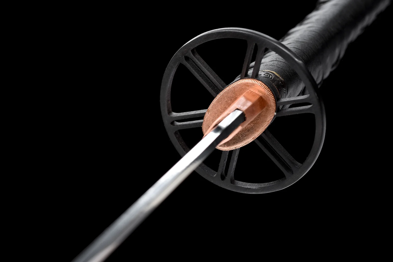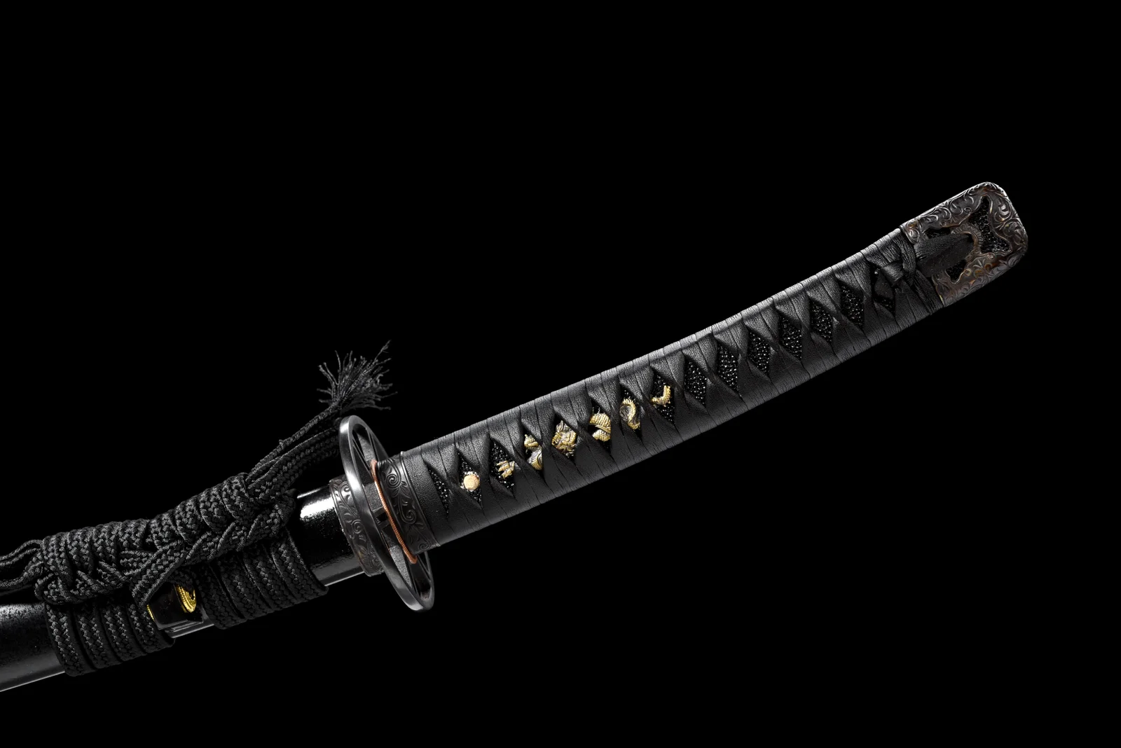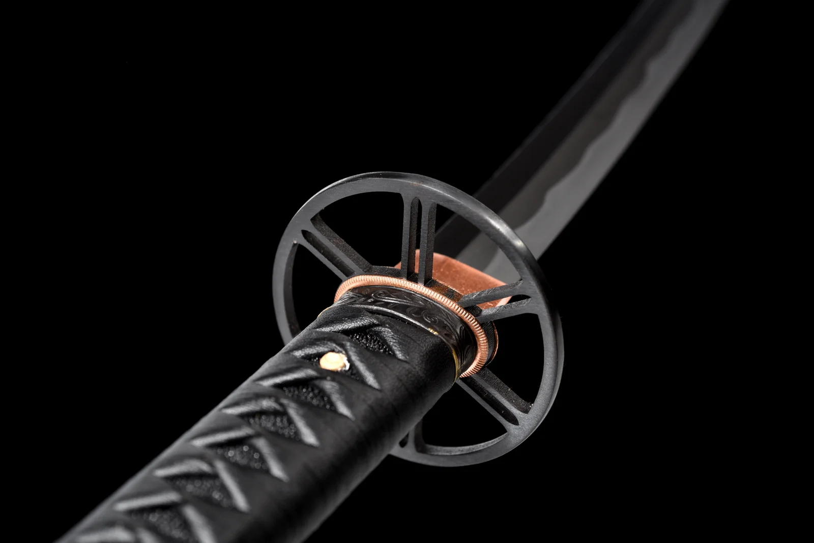 Thanh kiếm này là bản phục dựng từ Sakabatou – thanh katana gắn liền với nhân vật Himura Kenshin trong series Rurouni Kenshin. Lưỡi thép được chế tác từ thép T1095 hàm lượng carbon cao, nổi bật với đường hamon uốn lượn được tôi đất thủ công, vừa giữ độ sắc cao, vừa đảm bảo độ bền chắc. Tsuba đồng thiết kế màu đen tối giản, kết hợp cùng habaki đồng đỏ ôm sát, giữ sự vững chắc. Tsuka bọc da cá đuối đen, quấn chỉ đen truyền thống, xen lẫn menuki kim loại vàng tinh xảo. Saya phủ sơn mài đen bóng, kèm sageo đồng màu, tạo tổng thể trầm tĩnh nhưng đầy khí chất.