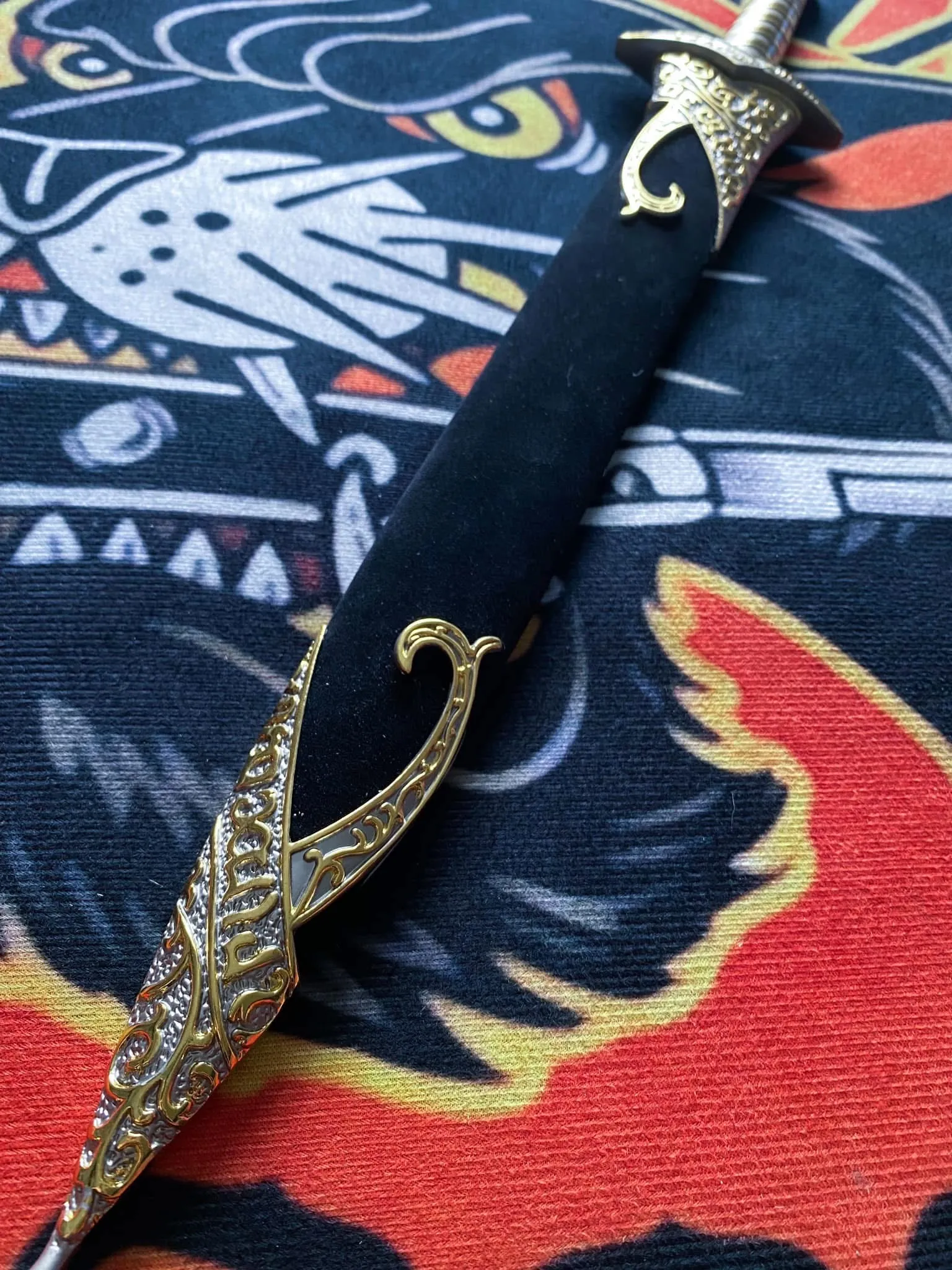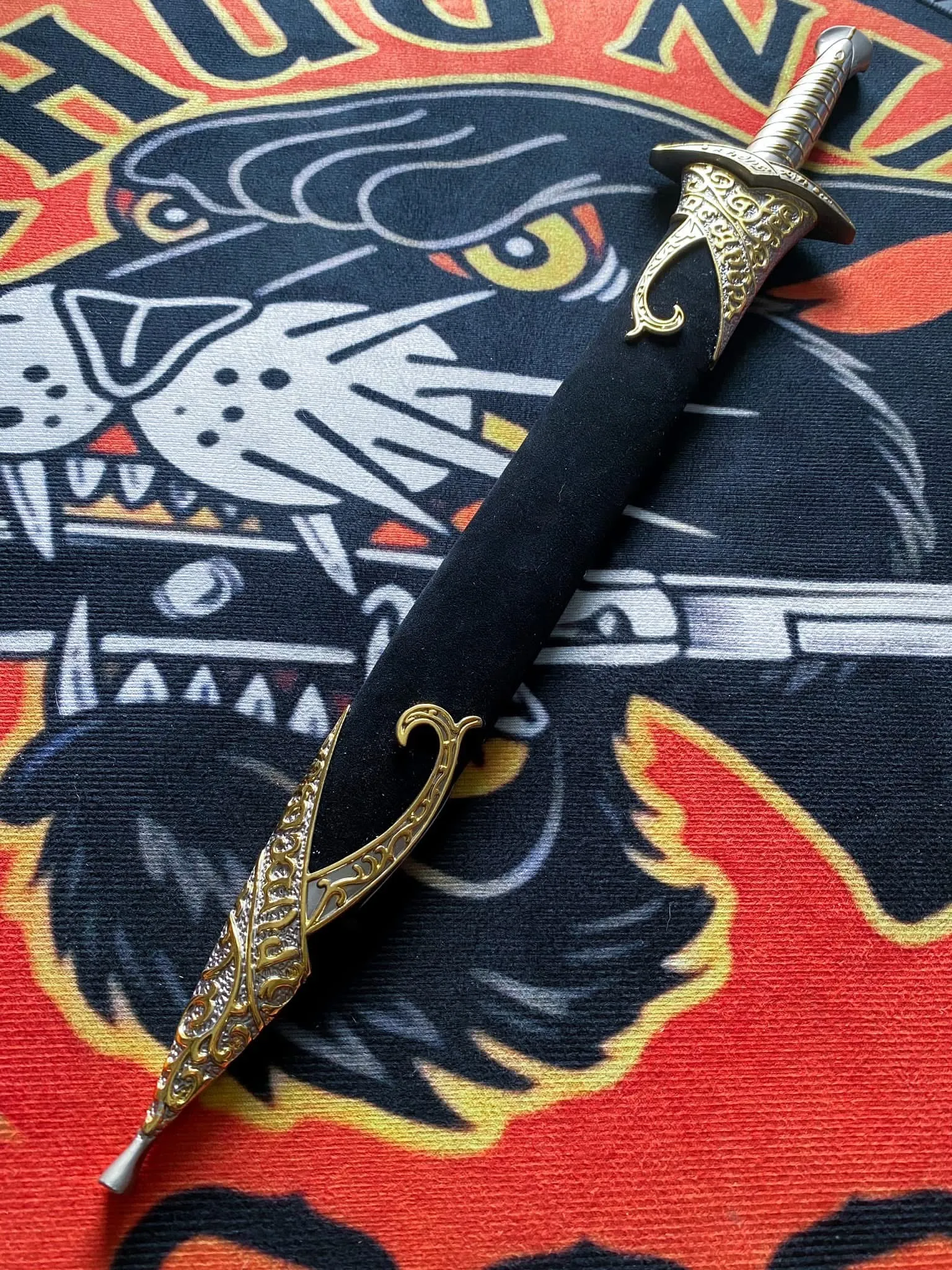 Được lấy cảm hứng rèn từ bộ phim The Hobbit & The Lord of the Rings mang đậm tinh thần của vùng đất Trung Địa, Sting Sword là thanh kiếm trứ danh đã đồng hành cùng nhân vật BilboFrodo trong hành trình đối đầu với bóng tối. Thiết kế lưỡi kiếm độc đáo bằng thép không gỉ, khắc chữ cổ Elvish dọc sống lưỡi, mang lại nét cổ xưa ma mị. Tay cầm được chế tác tinh xảo, bọc kim loại ánh bạc kết hợp họa tiết vàng xoay quanh, toát lên vẻ cao quý của một vũ khí Elf. Vỏ của thanh Sting Sword là điểm nhấn nghệ thuật với những đường chạm khắc họa tiết ánh kim tinh tế – hiện có hai phiên bản nâu và đen. Từ cosplay, trưng bày đến sưu tầm – Sting Sword là món báu không thể thiếu với bất kỳ fan nào của thế giới The HobbitThe Lord of the Rings.