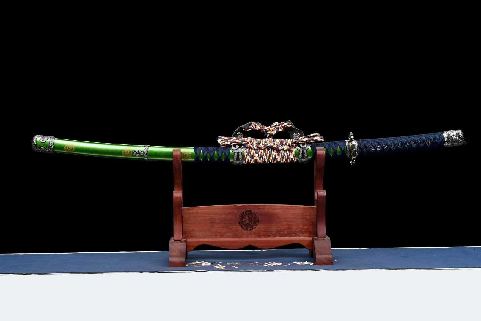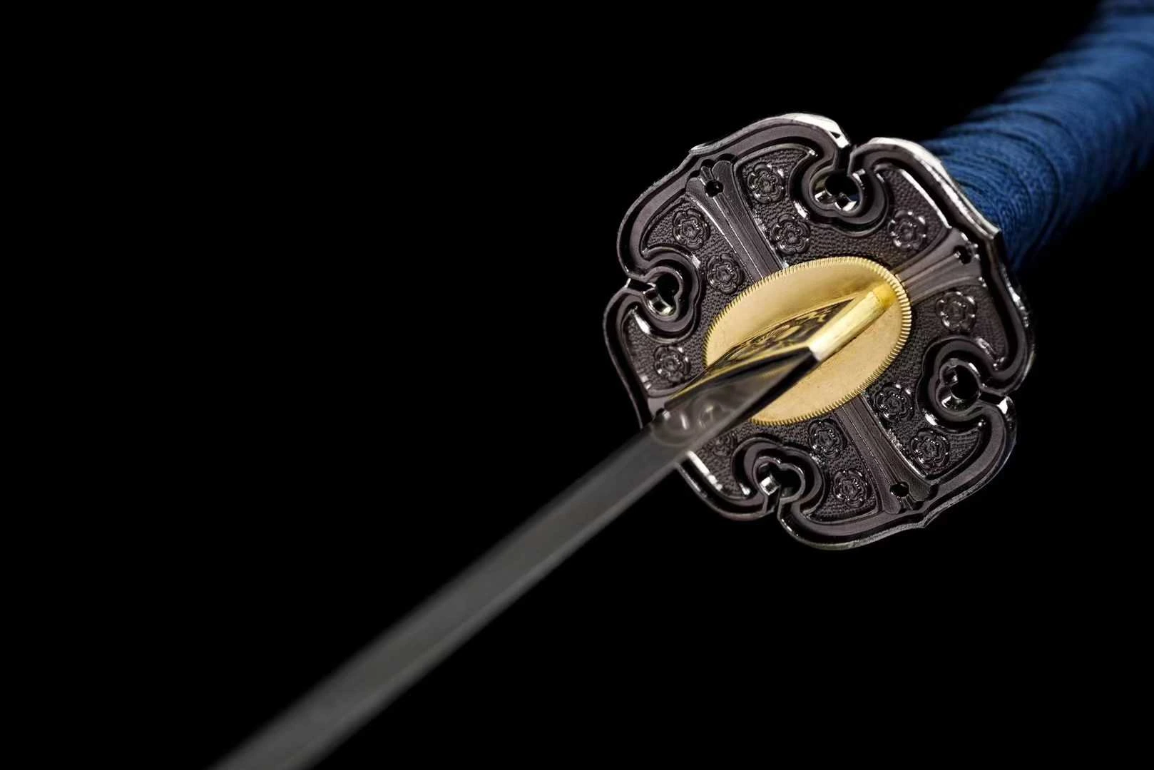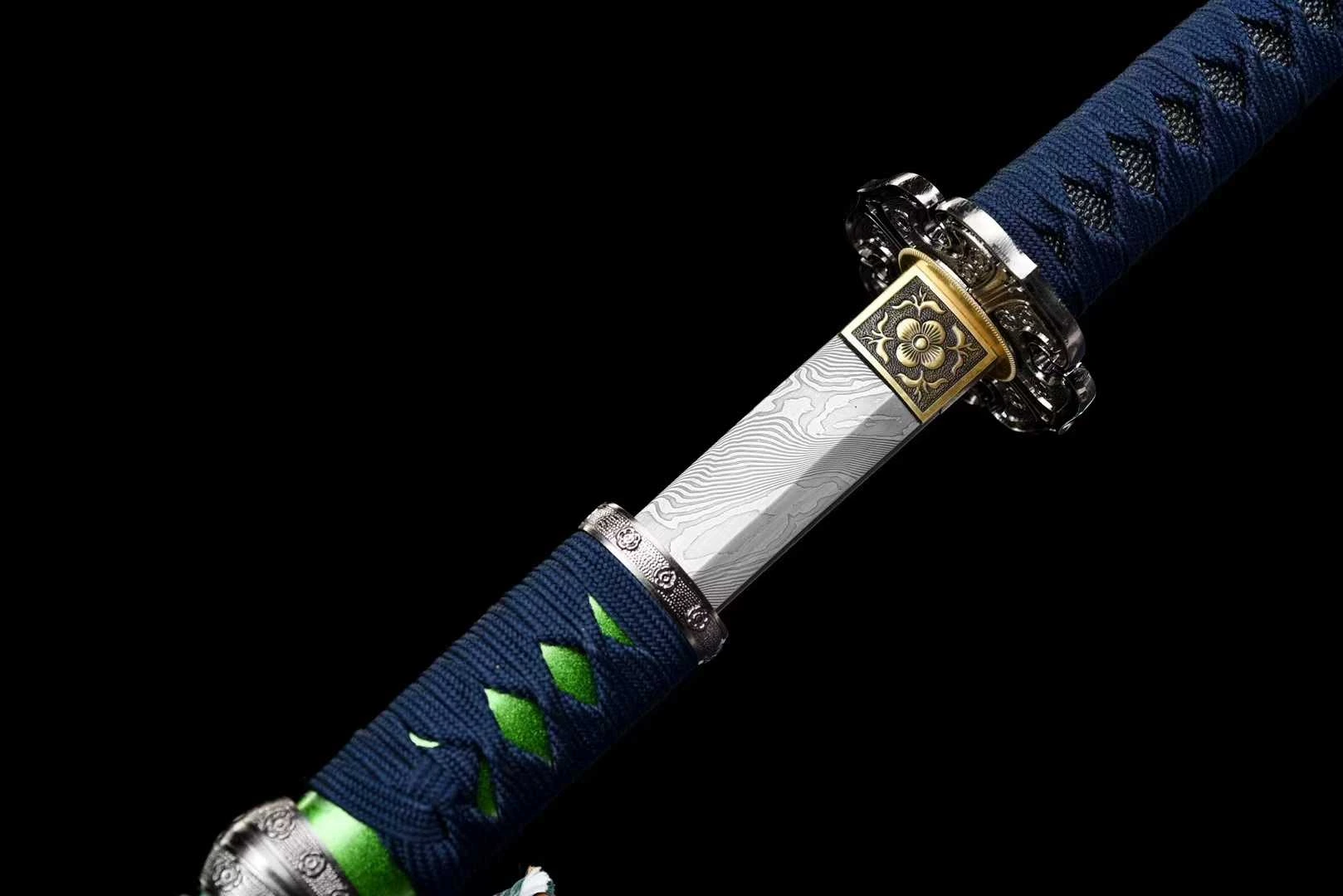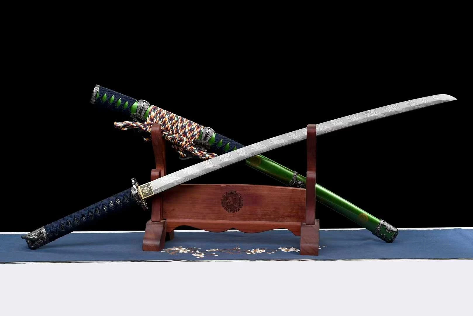 Thanh Tachi này là một tuyệt tác mang đậm phong thái quý tộc Samurai, kết hợp kỹ thuật rèn thép gấp hoa văn damascus tinh xảo với thiết kế sang trọng và độc đáo. Lưỡi kiếm tachi rèn từ thép gấp hoa văn, bề mặt hiện rõ đường vân sóng uốn lượn và hoa văn nổi tự nhiên từ quá trình rèn, tạo hiệu ứng thị giác sống động và tăng độ bền, độ dẻo dai cho lưỡi. Mũi lưỡi (kissaki) được mài sắc gọn, giữ dáng truyền thống, tối ưu cho cả cắt chém và trưng bày. Habaki Mạ vàng họa tiết hoa mai tinh xảo, ôm khít lưỡi, vừa bảo vệ vừa tăng tính thẩm mỹ. Tsuba thiết kế dạng họa tiết hoa văn cổ điển, tông bạc tối ánh thép, viền cong mềm mại và được chạm trổ tỉ mỉ, gợi cảm giác quyền quý. Tsuka(chuôi) quấn ito xanh navy trên nền da cá ngọc trai, tạo sự tương phản nổi bật, các chi tiết menuki và fuchi-kashira tông bạc khắc hoa văn đồng bộ với tsuba, tạo sự liền mạch thiết kế cho thanh Tachi. Saya(Vỏ) sơn mài xanh ngọc lục bảo bóng loáng, in họa tiết gia huy vàng, kết hợp các khớp nối và chape bạc chạm trổ tinh xảo. Sageo nhiều màu đan thủ công, tạo điểm nhấn mạnh về phong cách và tính sưu tầm. Phù hợp cho trưng bày sưu tầm lẫn luyện tập các bài tập kiếm đạo, tái hiện trang phục – vũ khí Samurai, hoặc sử dụng trong các màn trình diễn kiếm thuật mang tính nghệ thuật.