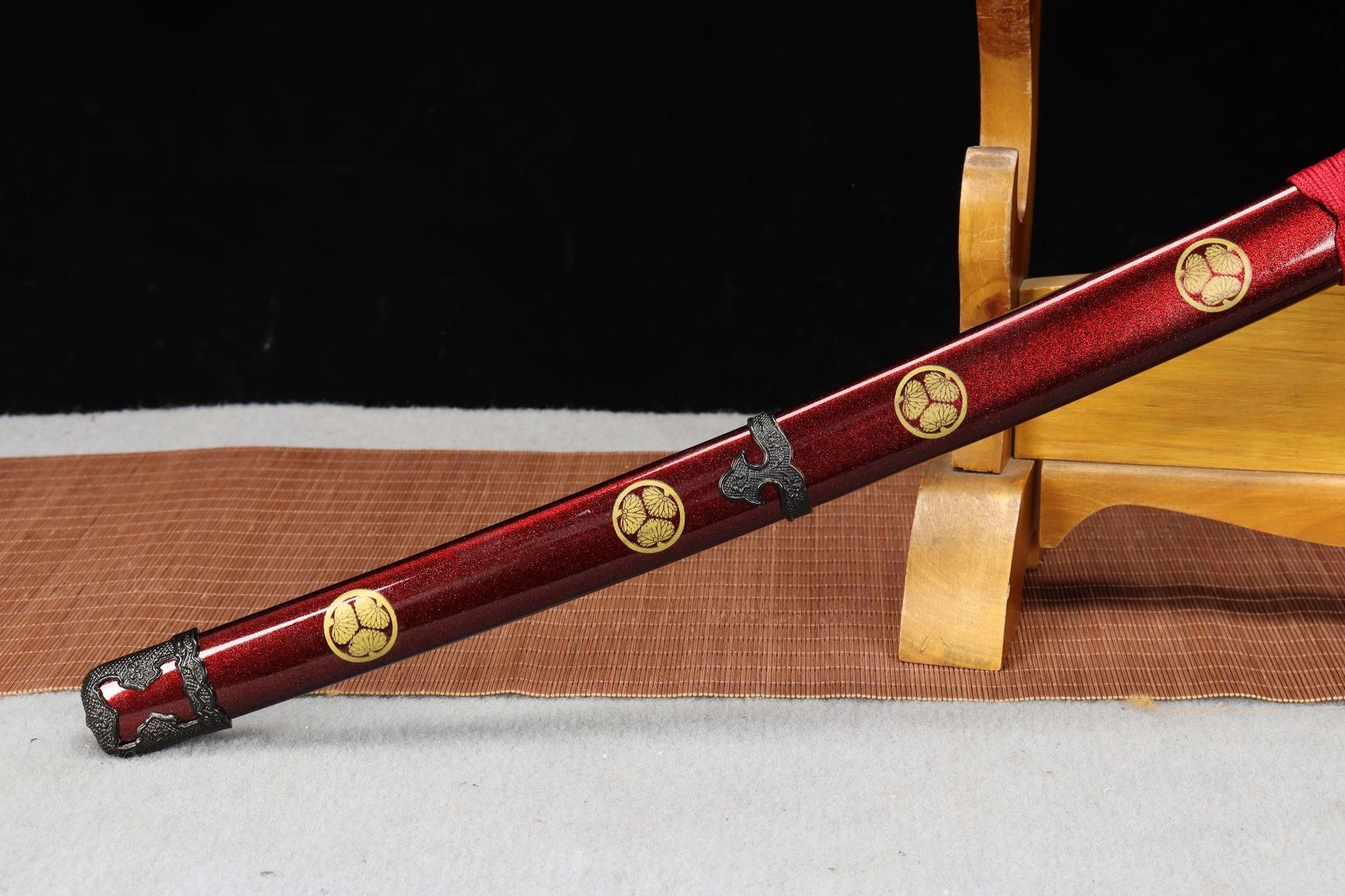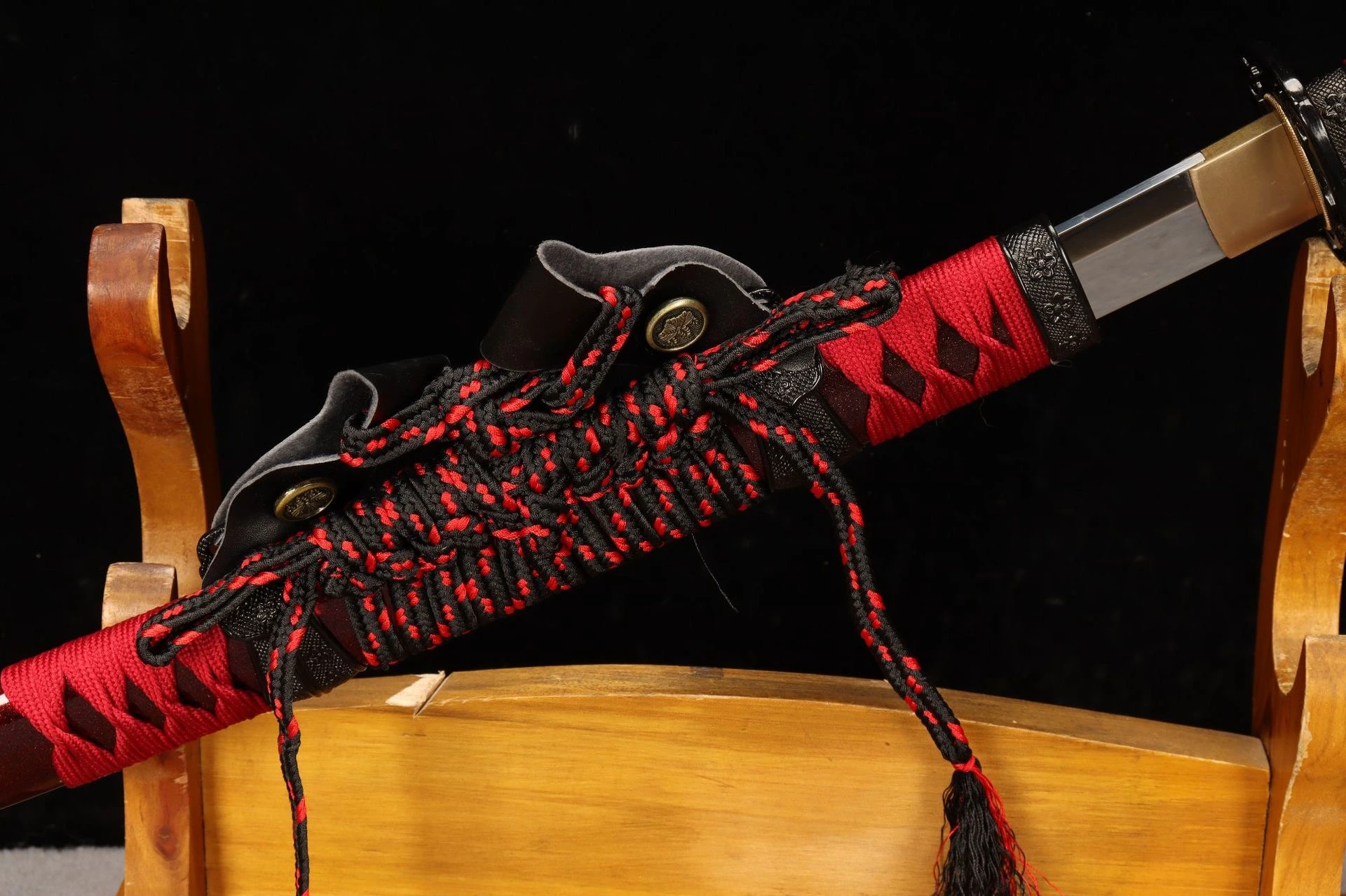 Thanh tachi này được rèn thủ công từ thép mangan, nổi bật với lưỡi kiếm sáng gương bóng loáng, phản chiếu ánh sáng mạnh mẽ và tôn lên sự sắc bén uy lực. Thiết kế lưỡi cong dài, dáng kiếm truyền thống chuẩn mực, kết hợp cùng đường mài tinh xảo giúp thanh kiếm không chỉ đẹp mắt mà còn giữ được độ bền và khả năng chém cắt hiệu quả. Phần tsuka được quấn dây đỏ – đen nổi bật, bên trong lót da cá ngọc trai đen, tạo độ ma sát chắc tay khi cầm. Tsuba và các chi tiết kim loại chạm khắc hoa văn cổ điển, phủ màu tối mạnh mẽ, tăng thêm sự oai nghiêm và cổ kính. Vỏ kiếm saya đỏ sơn mài ánh kim, trang trí bằng phù hiệu vàng truyền thống, kết hợp dây buộc đỏ – đen. Đây là một thanh tachi không chỉ mang giá trị thẩm mỹ cao mà còn có tính ứng dụng trong luyện tập và trưng bày. Với nền thép mangan sáng gương cùng phong cách chế tác chuẩn mực, thanh tachi này là lựa chọn hoàn hảo cho những nhà sưu tầm và người đam mê văn hóa kiếm đạo Nhật Bản.