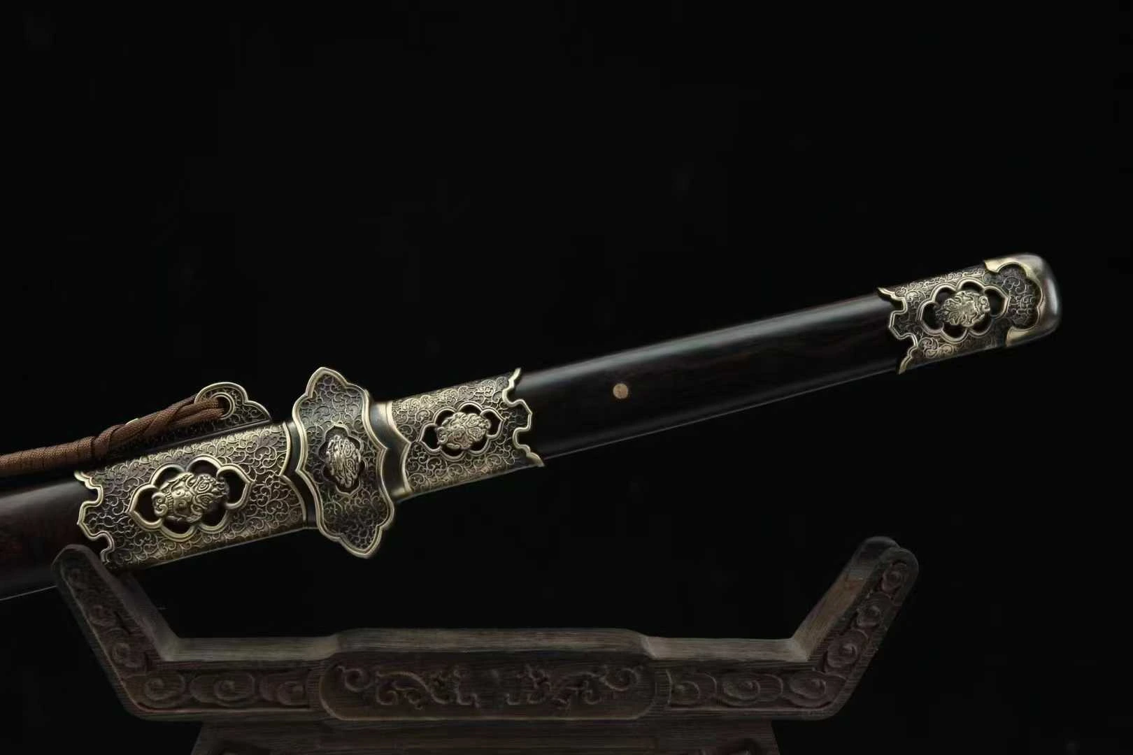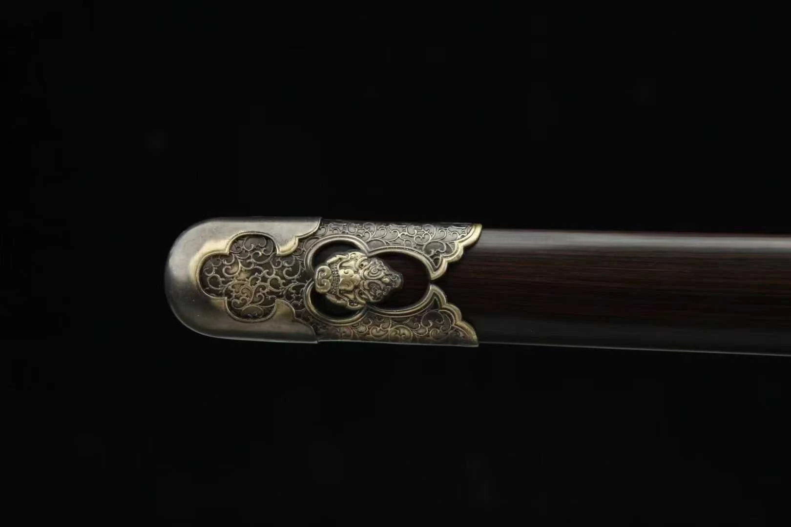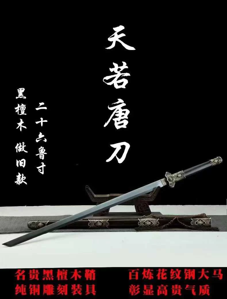 Là hiện thân của phong cách kiếm Đường (唐刀) – dòng đao biểu tượng của triều đại nhà Đường (618–907), “Thiên Nhược Đường Đao” là sự kết hợp giữa nghệ thuật chế tác cổ truyền và kỹ thuật luyện kim hiện đại, mang theo thần thái trầm hùng và quý tộc. Lưỡi thép được rèn từ thép hoa văn, với những vân thép đều và rõ. Mũi đao được mài sắc dạng thẳng – phù hợp cho cả tập luyện và trưng bày, mang đến hiệu suất thực chiến và độ cứng cao. Thủ hộ thiết kế bốn cánh hoa mềm mại theo phong cách hoa viên Đường triều, chạm nổi họa tiết đầu sư tử – biểu tượng của sức mạnh và quyền uy. Đồng nguyên khối được xử lý oxi hóa tạo tông màu cổ kính, gợi cảm giác cổ vật trưng bày cung đình. Bao kiếm làm từ gỗ mun đen nguyên khối, được đánh bóng tự nhiên, ôm khít lưỡi kiếm. Các ngạnh treo và vòng khóa đều đúc từ đồng, khắc hoa văn cổ điển với hình tượng “hổ phù” – thể hiện sát khí và trấn áp tà ma – mang tính phong thủy.