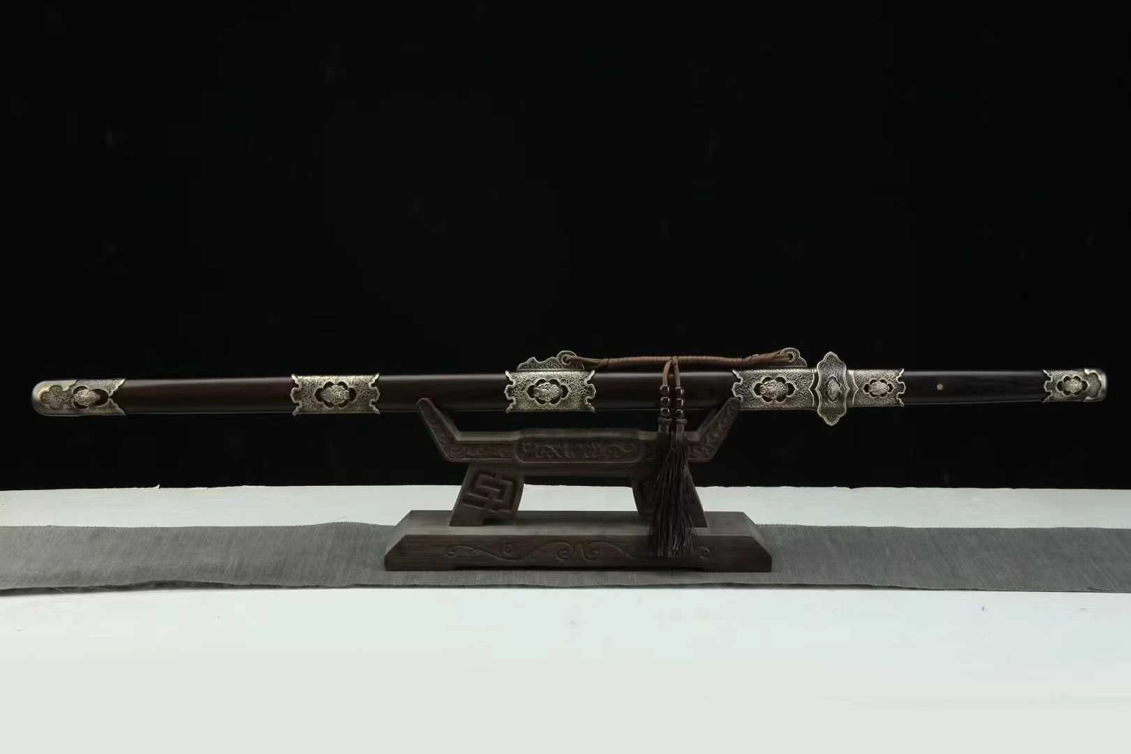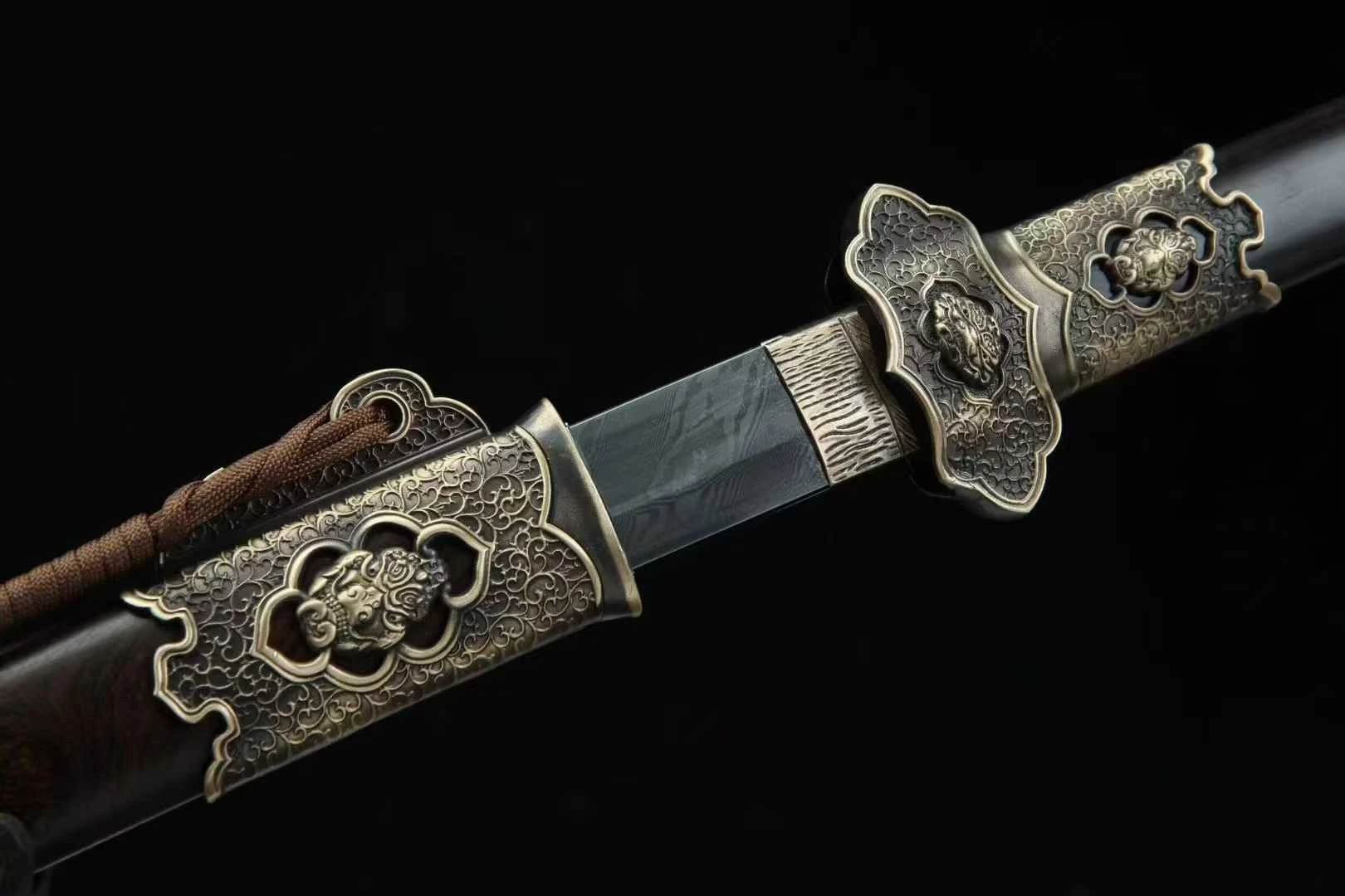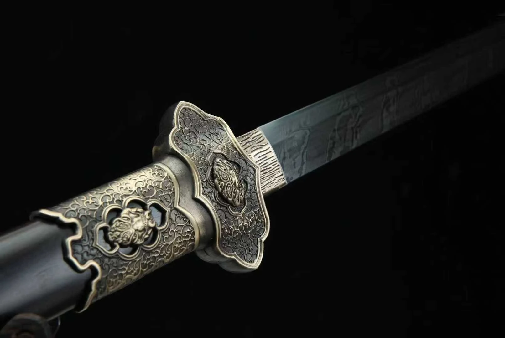 Là hiện thân của phong cách kiếm Đường (唐刀) – dòng đao biểu tượng của triều đại nhà Đường (618–907), “Thiên Nhược Đường Đao” là sự kết hợp giữa nghệ thuật chế tác cổ truyền và kỹ thuật luyện kim hiện đại, mang theo thần thái trầm hùng và quý tộc. Lưỡi thép được rèn từ thép hoa văn, với những vân thép đều và rõ. Mũi đao được mài sắc dạng thẳng – phù hợp cho cả tập luyện và trưng bày, mang đến hiệu suất thực chiến và độ cứng cao. Thủ hộ thiết kế bốn cánh hoa mềm mại theo phong cách hoa viên Đường triều, chạm nổi họa tiết đầu sư tử – biểu tượng của sức mạnh và quyền uy. Đồng nguyên khối được xử lý oxi hóa tạo tông màu cổ kính, gợi cảm giác cổ vật trưng bày cung đình. Bao kiếm làm từ gỗ mun đen nguyên khối, được đánh bóng tự nhiên, ôm khít lưỡi kiếm. Các ngạnh treo và vòng khóa đều đúc từ đồng, khắc hoa văn cổ điển với hình tượng “hổ phù” – thể hiện sát khí và trấn áp tà ma – mang tính phong thủy.