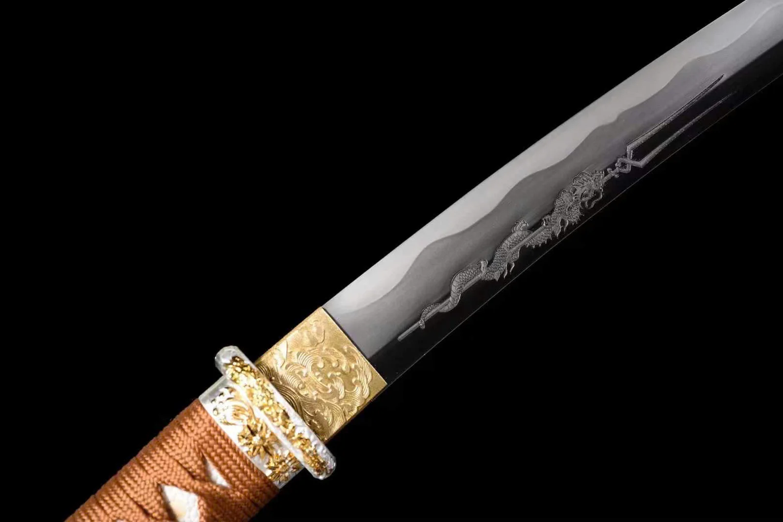 thanh Tanto chế tác từ thép T1095 carbon cao. Nổi bật với lưỡi thép sắc bén được chạm khắc tinh xảo hình Rồng (long) và Tam Xoa Kích, cùng với bao kiếm (saya) màu lấp lánh sang trọng. Chất liệu lưỡi thép T1095 carbon cao, nổi tiếng với độ cứng và khả năng giữ cạnh. Lưỡi được tôi luyện và mài sắc thủ công, thể hiện đường lượn sóng (hamon) tự nhiên đẹp mắt, trang trí họa tiết Rồng uốn lượn và biểu tượng Tam Xoa Kích, mang ý nghĩa về sức mạnh và sự bảo vệ. Habaki & Seppa kim loại mạ vàng và bạc, tạo điểm nhấn sang trọng giữa lưỡi và chuôi kiếm. Tsuka (chuôi kiếm) được bọc da cá ngọc trai và quấn dây màu nâu đồng chắc chắn, với các menuki mạ vàng nổi bật. Saya (Bao Kiếm) vỏ kiếm sơn mài màu đồng lấp lánh (sparkle finish), đi kèm dây buộc (sageo) cùng tông màu, thể hiện sự cao cấp và độc đáo. Tantō có kích thước nhỏ gọn, lý tưởng để trưng bày hoặc sưu tầm.
