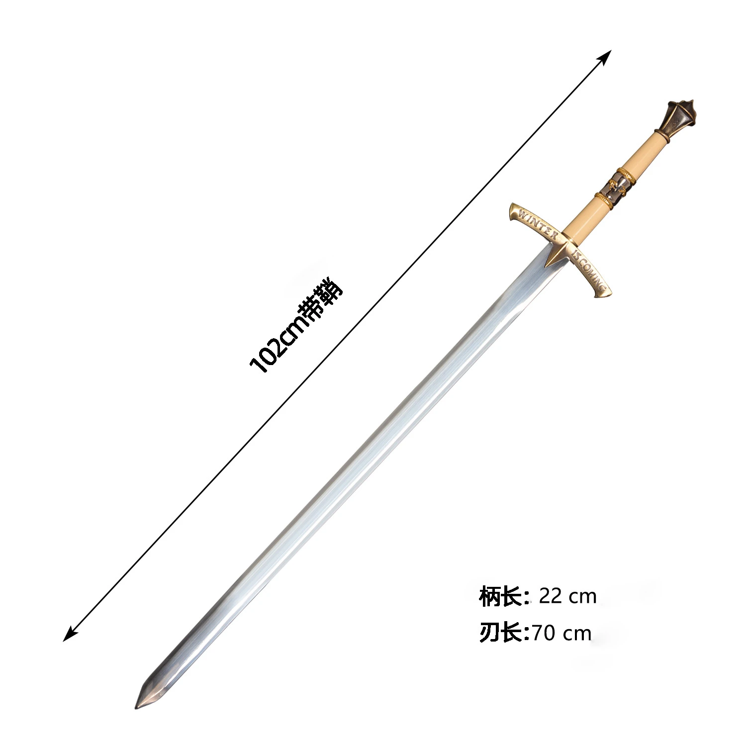 - Chiều dài tổng thể: 102 cm | chiều dài lưỡi kiếm: 70 cm | chiều dài tay cầm: 22 cm