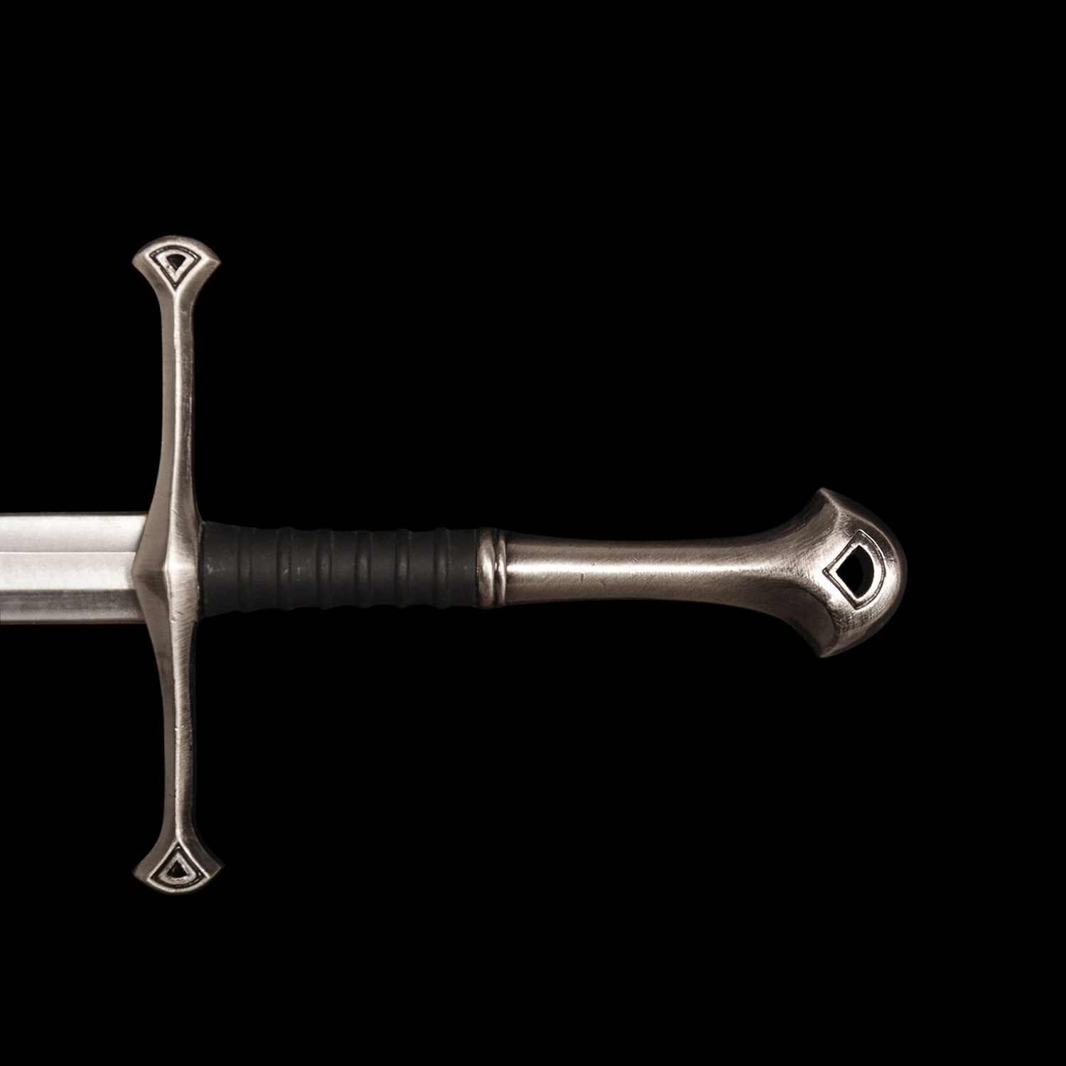 Đây là bản tái hiện của Andúril thiết kế với kích thước nhỏ, thanh kiếm Narsil huyền thoại được rèn lại từ lưỡi gãy của Narsil, và được Aragorn – vị vua tương lai của Gondor – mang theo trong cuộc chiến chống lại thế lực Sauron trong The Lord of the Rings. Lưỡi kiếm được chế tác từ thép không gỉ sáng bóng, thiết kế thẳng, có sống kiếm chạy dài giúp tăng độ bền và sự cân bằng. Chuôi kiếm dài, vừa tay cầm, với pommel và guard chạm khắc biểu tượng Gondor, thể hiện dòng máu hoàng tộc Dúnedain cao quý. Vỏ kiếm màu đen nhám, đi kèm dây đeo da nâu chéo – tăng tính thẩm mỹ khi trưng bày hoặc cosplay. Sản phẩm thích hợp cho người sưu tầm, fan điện ảnh hoặc decor phong cách fantasy.