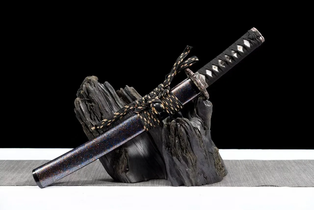 Chuôi Tanto bằng gỗ, kết hợp tsuba hợp kim cổ đỏ và habaki đồng chạm khắc, hoàn thiện đồng bộ. Bao kiếm gỗ sơn mài đi kèm dây treo bản lớn, tăng tính thẩm mỹ tổng thể cho Tanto.