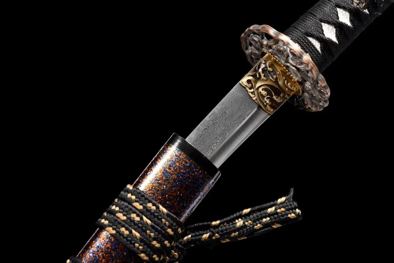 Chuôi Tanto bằng gỗ, kết hợp tsuba hợp kim cổ đỏ và habaki đồng chạm khắc, hoàn thiện đồng bộ. Bao kiếm gỗ sơn mài đi kèm dây treo bản lớn, tăng tính thẩm mỹ tổng thể cho Tanto.
