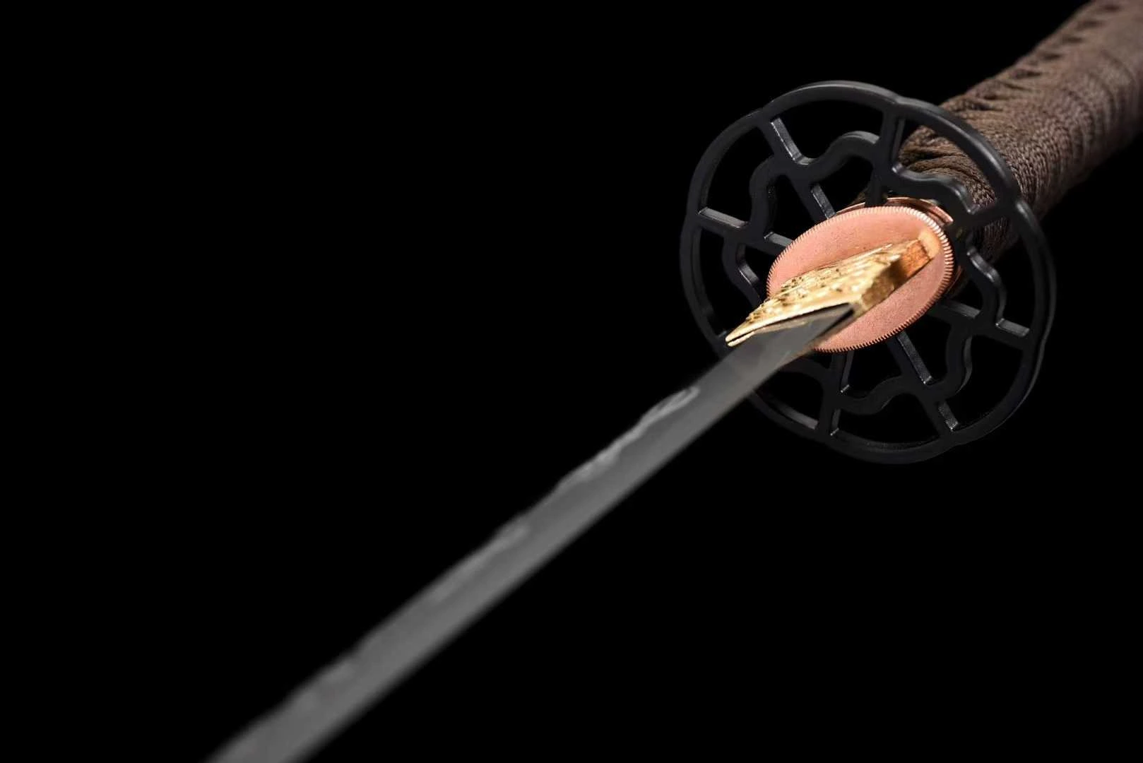 Thanh wakizashi mang vẻ trầm tĩnh và chuẩn mực, nổi bật bởi hamon sóng mềm và chi tiết khắc thủ công. Lưỡi của thanh wakizashi rèn với thép T8 carbon cao (độ cứng tốt, giữ sắc lâu), tôi đất nung tạo hamon dạng sóng rõ nét; bề mặt mài bóng gương, khắc họa tiết trang trí tinh xảo dọc sống lưỡi. Habaki & Seppa đồng chạm khắc mạ vàng, ôm khít lưỡi, tăng độ chắc chắn và sang trọng. Tsuba(chắn tay) cắt lỗ phủ đen phong cách tối giản – hiện đại, cân bằng đẹp với tổng thể trầm tối. Tsuka quấn ito nâu đất thủ công trên lớp da cá ngọc trai(samegawa) trắng, điểm menuki đen nổi khối, cầm chắc tay. Saya(Vỏ) sơn mài đen hạt (ishime) bền mặt, sageo mận chín buộc truyền thống; kurikata gắn chi tiết ánh vàng tinh tế. Phù hợp sưu tầm – trưng bày – diễn luyện kata/iaido; lưỡi T8 sắc xảo, ổn định, dễ bảo dưỡng khi được lau dầu định kỳ.