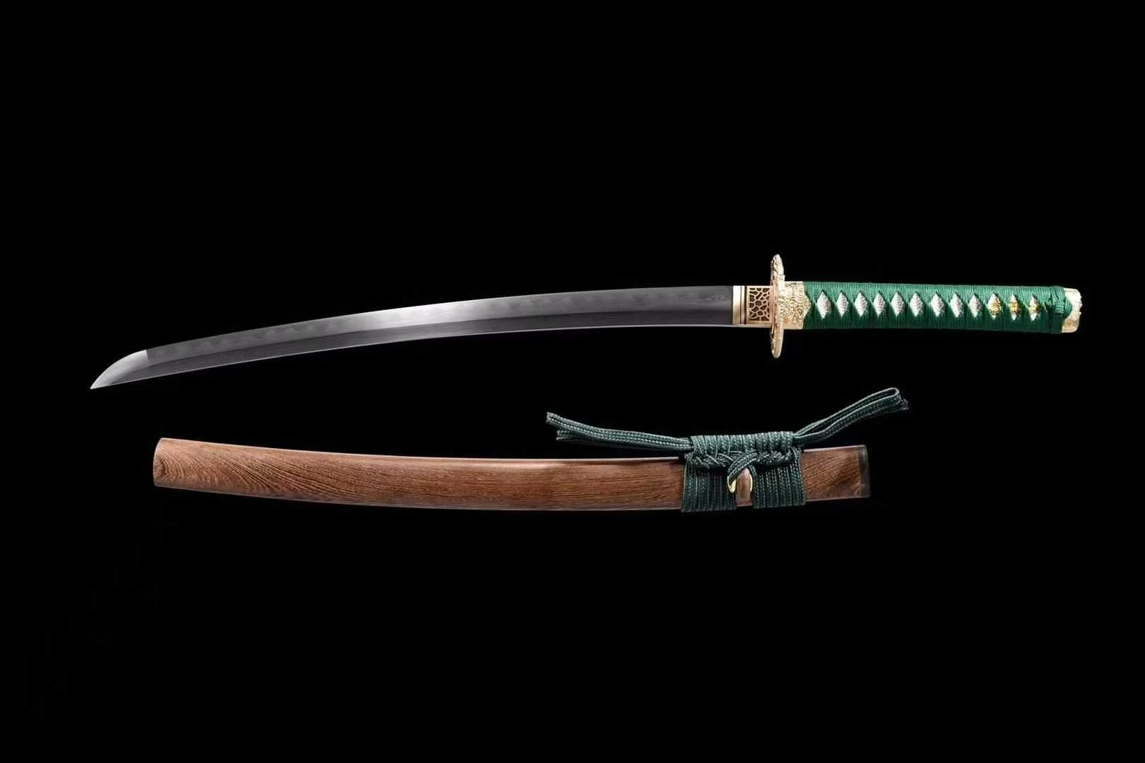 Mẫu wakizashi này sở hữu lưỡi thép gấp (folded steel) nổi bật với hoa văn sống động chạy dọc theo thân kiếm, Lưỡi kiếm của wakizashi được mài sắc với phần shinogi rõ nét, cong nhẹ tạo cảm giác linh hoạt, uyển chuyển. Đây là loại lưỡi có thể sử dụng trong cận chiến với tốc độ rút nhanh, chém gọn. Tsuba được chế tác tỉ mỉ bằng hợp kim màu vàng đồng, chạm rồng nổi 3D mang ý nghĩa bảo hộ và quyền uy, kết hợp cùng habaki tạo hình lưới tinh tế, nâng cao vẻ sang trọng tổng thể. Tsuka (chuôi kiếm) được bọc bằng ito xanh lục đậm trên nền rayskin trắng, đan theo kiểu truyền thống với menuki vàng làm điểm nhấn. Đầu chuôi (kashira) đúc nổi hình tượng long quy cổ xưa, tạo cảm giác quyền năng và lịch lãm. Saya (vỏ kiếm) sử dụng gỗ thật vân tự nhiên, kết hợp với sageo màu xanh đậm thủ công cầu kỳ, mang phong cách vừa cổ điển vừa hiện đại. Đây là một thanh wakizashi sở hữu thiết kế hài hòa giữa cổ điển và nghệ thuật đương đại. Lưỡi thép gấp với vân hoa tinh xảo, cùng hệ thống phụ kiện mạ vàng chạm rồng tạo nên khí chất vừa mạnh mẽ vừa quý tộc – lý tưởng để trưng bày, sưu tầm hoặc làm quà tặng mang tính biểu trưng cao