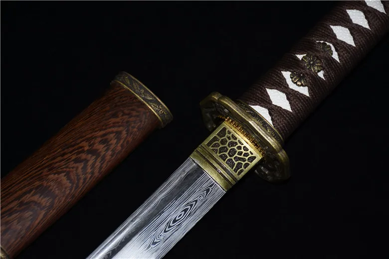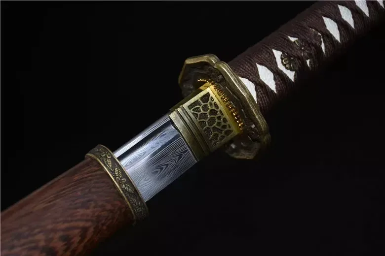Thanh wakizashi mang phong thái tĩnh lặng và uy nghi, được rèn thủ công từ thép hoa văn Damascus – nổi bật với những đường vân tự nhiên. Lưỡi kiếm cong nhẹ, sắc bén, với kết cấu vân nổi rõ dọc thân. Habaki chạm khắc đồng cổ tinh xảo, ôm khít phần lưỡi, tạo điểm nhấn uy nghi cho tổng thể. Tsuba mang họa tiết hoa văn cổ, thể hiện sự trân trọng tinh thần võ sĩ đạo trong từng chi tiết. Tsuka được quấn dây nâu sẫm truyền thống, kết hợp họa tiết menuki hoa cúc ẩn hiện bên dưới lớp bọc trắng, đem lại cảm giác cầm chắc tay và cổ kính. Saya chế tác từ gỗ mun vân tự nhiên, phủ lớp sơn bảo vệ, đai đồng cổ bao quanh, tăng độ bền và vẻ sang trọng. Một thanh kiếm dành cho người sưu tầm tinh tế – vừa là kiếm trưng bày, vừa có thể rút ra luyện tập.