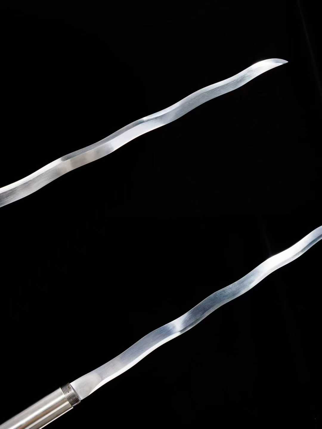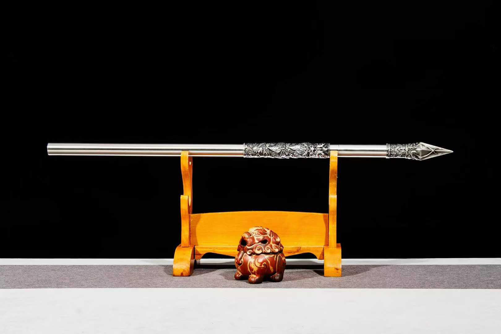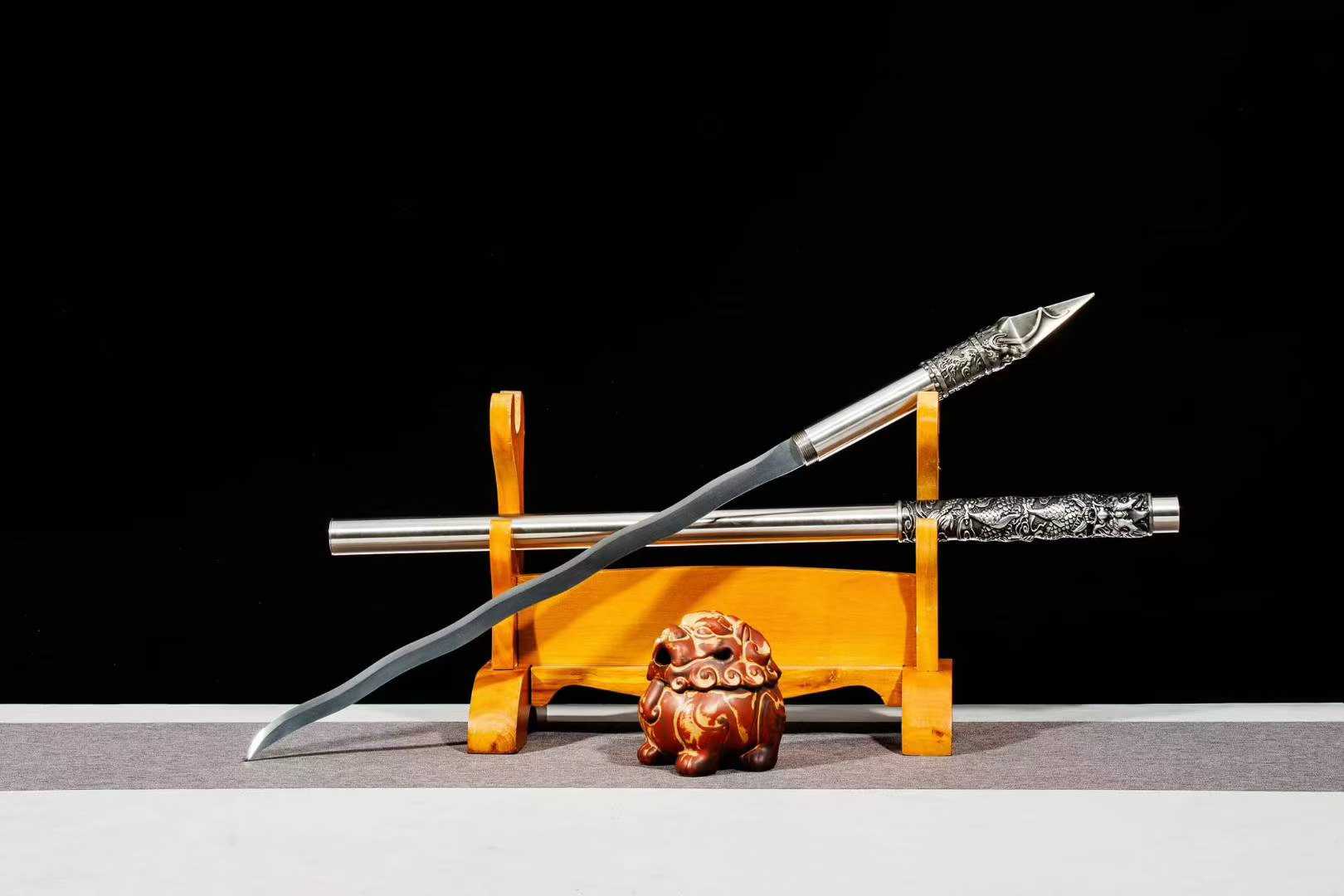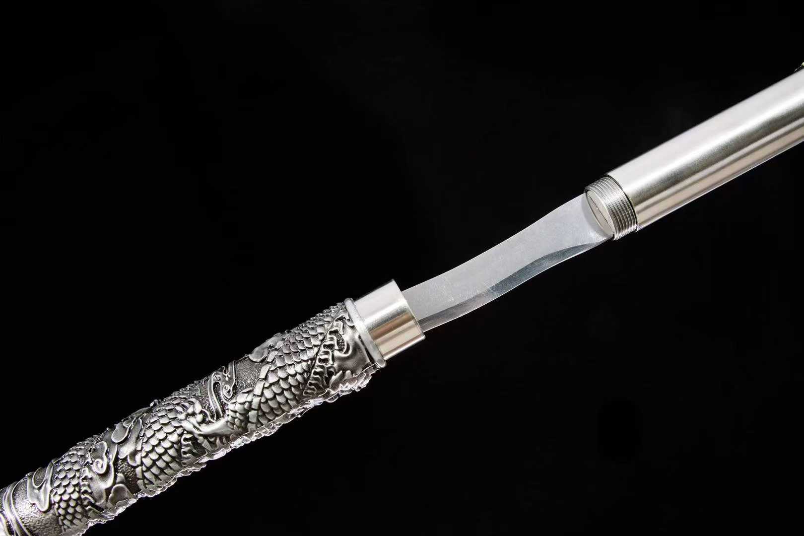 Một tác phẩm mang khí chất chiến binh cổ đại kết hợp tinh xảo của nghệ thuật kim loại hiện đại – Xà trụ, thiết kế tháo lắp linh hoạt, với phần thân và vỏ được chạm khắc long phụng vân vũ, đầy uy lực và phong thủy. Lưỡi chế tác từ thép mangane. Thiết kế lưỡi lượn sóng tạo hiệu ứng thị giác ấn tượng, mô phỏng dòng rồng lượn trên mây. Mũi lưỡi mài sắc bén, nổi khối khỏe khoắn, tạo cảm giác vừa tinh xảo và thẩm mỹ. Cán và vỏ Làm bằng hợp kim dày, tông ánh bạc mạnh mẽ, được chạm khắc long ẩn trong mây nổi 3D sắc nét, không đơn thuần là một binh khí mà còn là một tác phẩm nghệ thuật trưng bày. Phần đầu cán điêu khắc mũi thương kiểu cổ, sắc lạnh, tạo điểm nhấn độc đáo và quyền uy cho tổng thể. Cấu trúc tháo lắp lưỡi được giấu kín bên trong thân, có thể xoáy ra thành xà trụ chiến đấu thực thụ – một dạng “kiếm ẩn trong gậy” đầy tinh vi và bất ngờ. Vừa có thể trưng bày như một cây trượng cổ, vừa có thể sử dụng như một lưỡi đao bí ẩn.