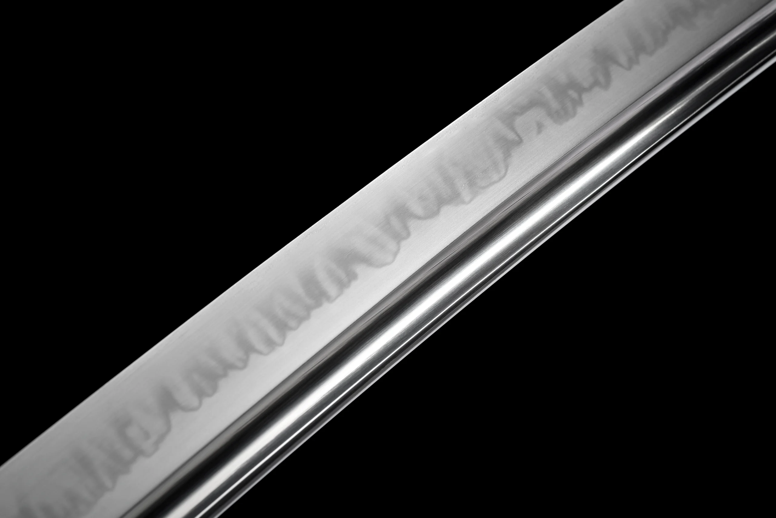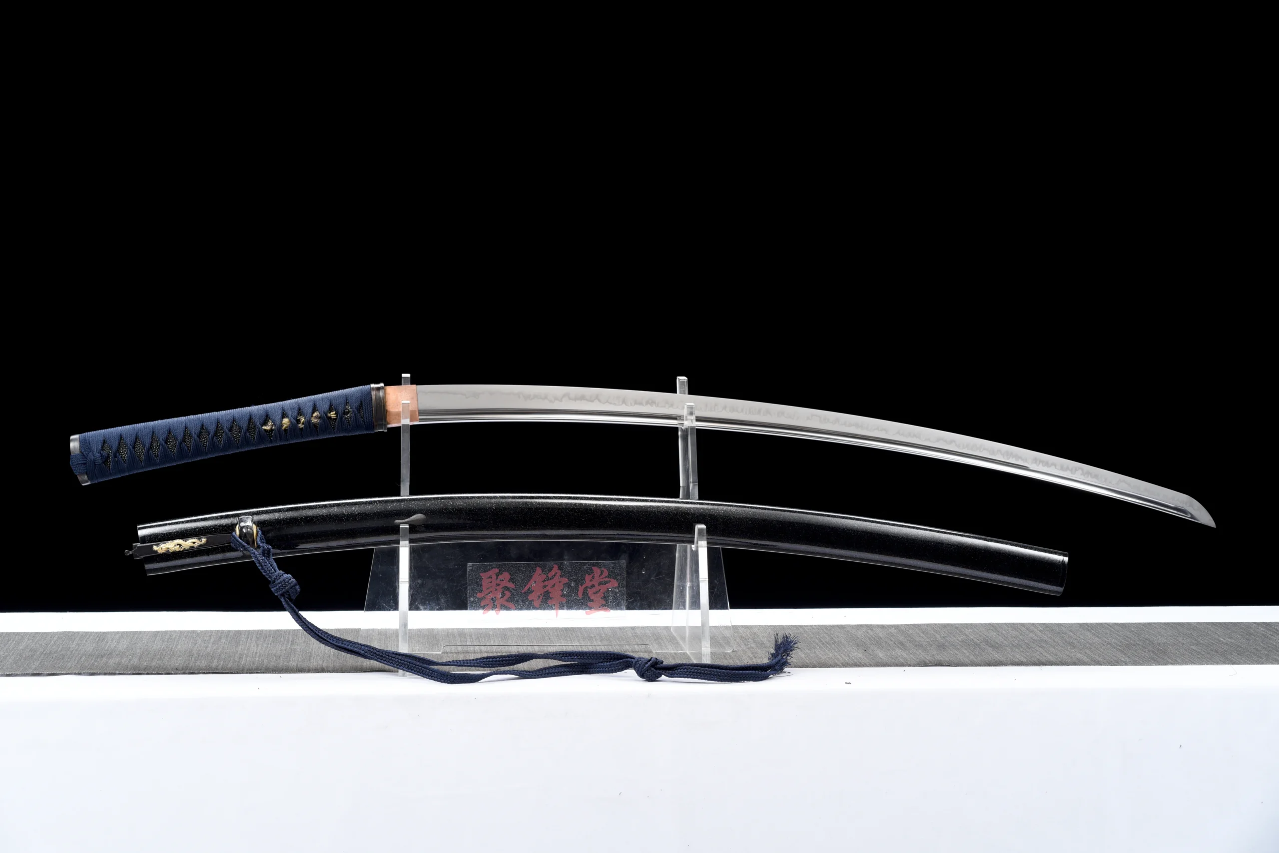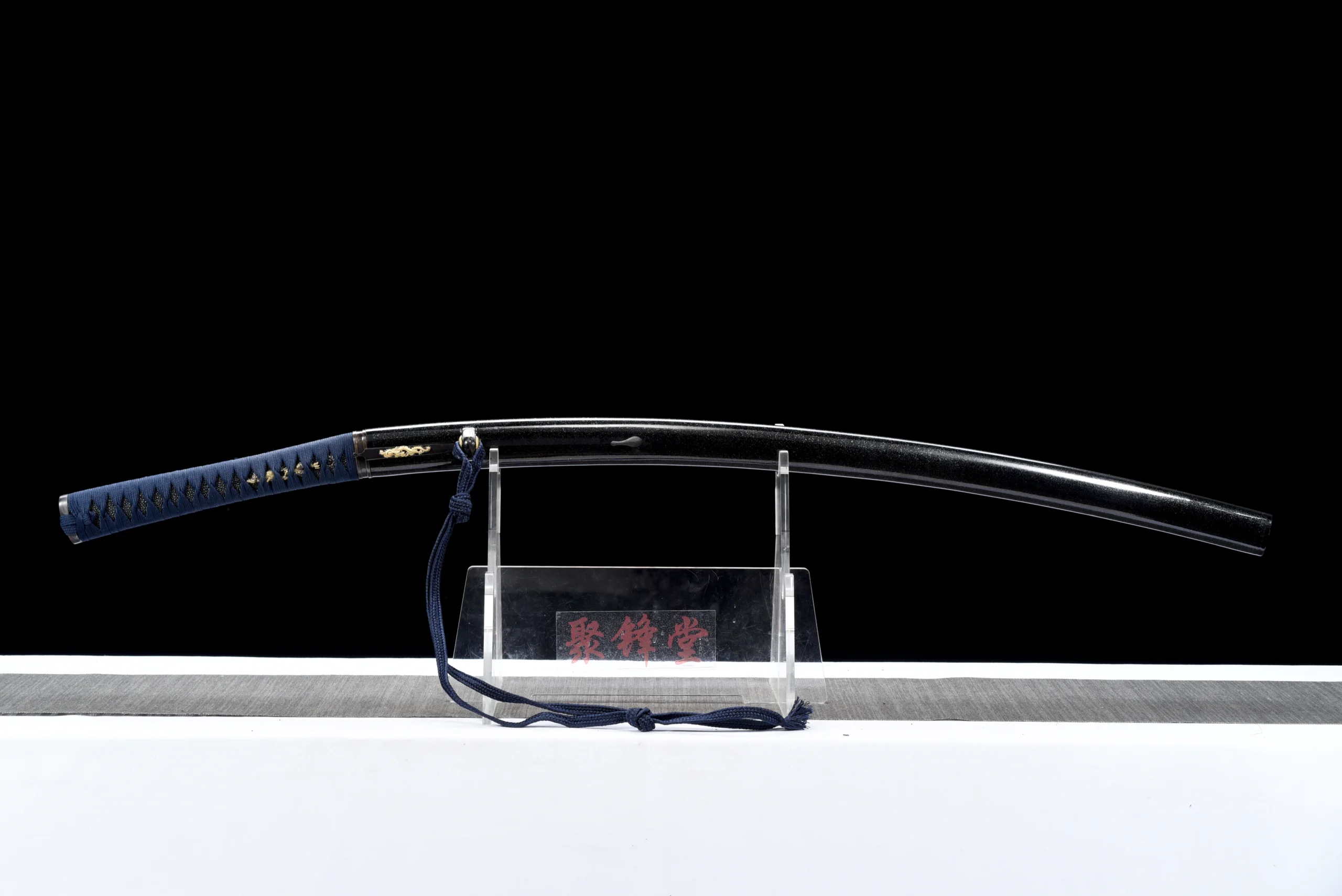 Katana được rèn từ thép 1095 hàm lượng carbon cao, nổi tiếng với độ cứng và khả năng giữ cạnh sắc vượt trội. Bề mặt lưỡi được xử lý thủ công và cắt góc bằng tay, tạo nên sắc độ tương phản. Lưỡi kiếm được xử lý nhiệt kết hợp tôi đất thủ công (clay tempering) cho ra đường hamon sống động, thể hiện tay nghề của người thợ rèn. Habaki thiết kế chắc chắn, giữ lưỡi cố định chắc chắn trong tsuka(tay cầm) và saya(vỏ). Tsuka(chuôi) bọc miếng da cá đuối lớn (samegawa), lớp dây ito quấn thủ công chắc chắn, giúp chống trơn trượt khi cầm nắm. Đinh sừng (mekugi) được đóng khít, gia cố độ an toàn. Kashira làm bằng chất liệu sừng và menuki tùy chỉnh với chi tiết hình đầu mũi tên, tôn thêm nét khí phách võ đạo. Saya(vỏ) phủ sơn mài thủ công, kết cấu ánh kim tinh tế. Thiết kế năm mảnh chạm hình sừng trâu, kết hợp miệng vỏ (koiguchi) và chốt kurigata. Toàn bộ cấu trúc liên kết bởi hai lớp ngói (shitaji), chắc chắn và mang tính thẩm mỹ cao. Sageo tết thủ công đồng màu, tạo sự cân đối thanh lịch. Đây là một thanh katana nghệ thuật thủ công, hội tụ đầy đủ yếu tố, độ sắc lẫn độ bền cao, và giá trị sưu tầm. Phù hợp cho võ đạo, trưng bày hoặc bộ sưu tập chuyên nghiệp.