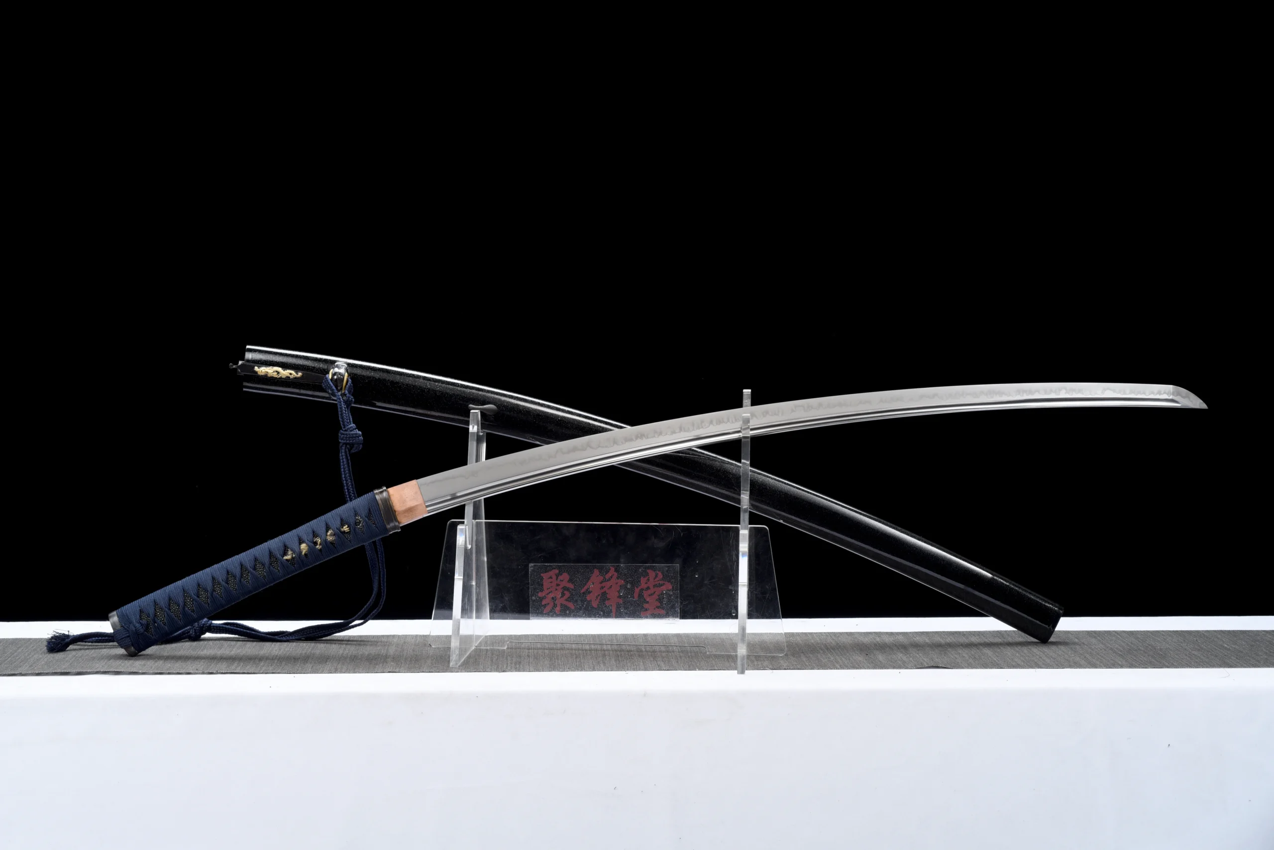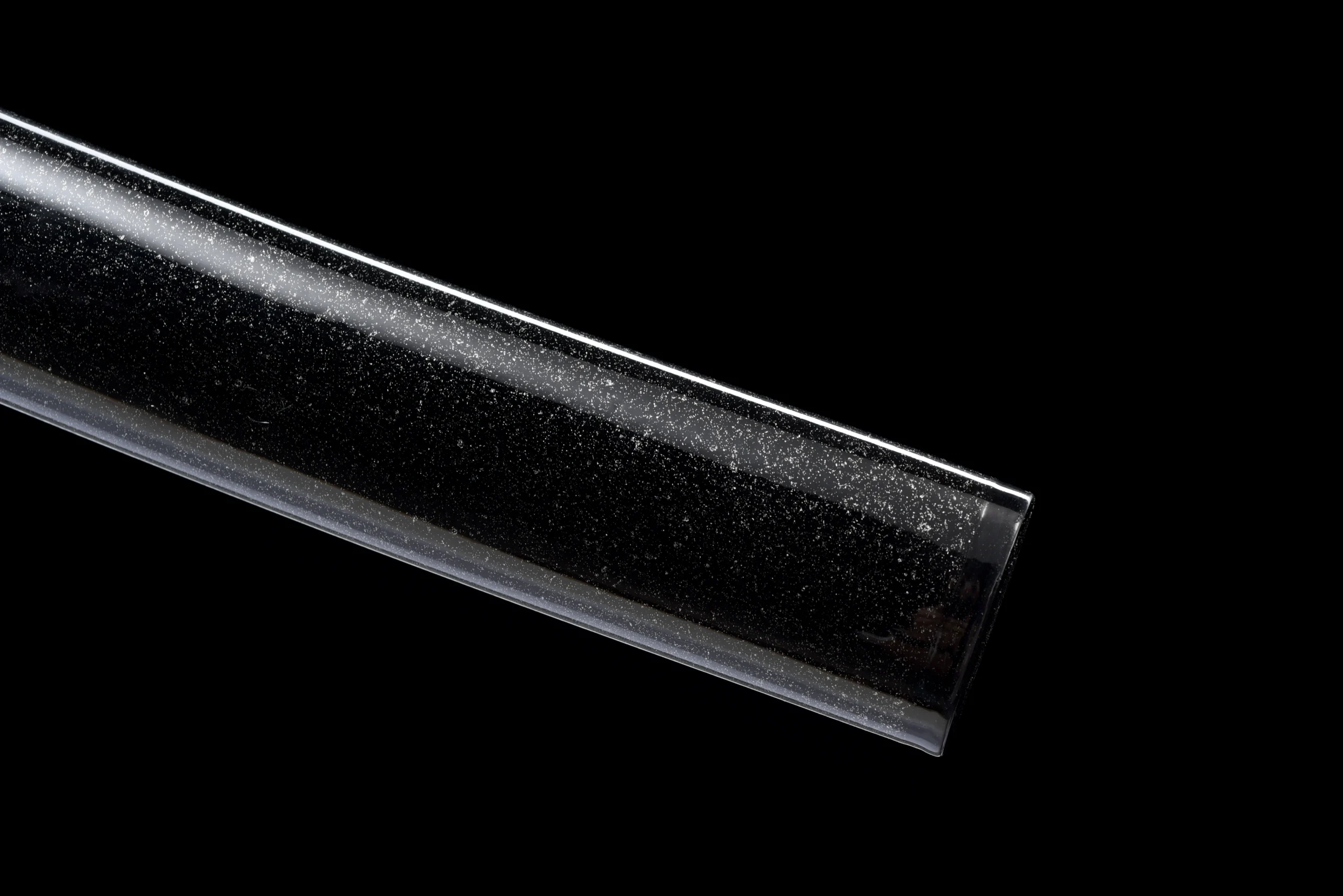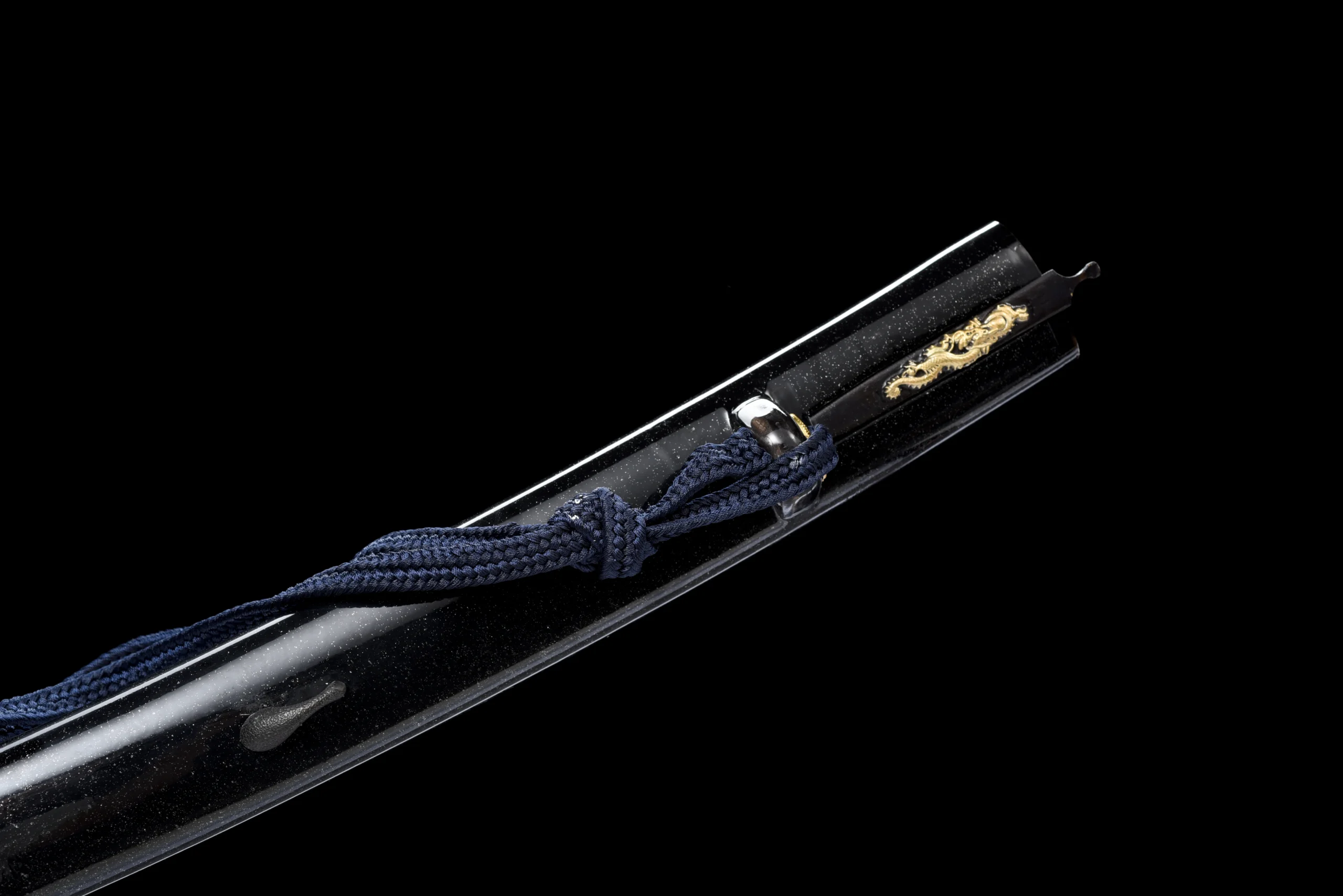 Katana được rèn từ thép 1095 hàm lượng carbon cao, nổi tiếng với độ cứng và khả năng giữ cạnh sắc vượt trội. Bề mặt lưỡi được xử lý thủ công và cắt góc bằng tay, tạo nên sắc độ tương phản. Lưỡi kiếm được xử lý nhiệt kết hợp tôi đất thủ công (clay tempering) cho ra đường hamon sống động, thể hiện tay nghề của người thợ rèn. Habaki thiết kế chắc chắn, giữ lưỡi cố định chắc chắn trong tsuka(tay cầm) và saya(vỏ). Tsuka(chuôi) bọc miếng da cá đuối lớn (samegawa), lớp dây ito quấn thủ công chắc chắn, giúp chống trơn trượt khi cầm nắm. Đinh sừng (mekugi) được đóng khít, gia cố độ an toàn. Kashira làm bằng chất liệu sừng và menuki tùy chỉnh với chi tiết hình đầu mũi tên, tôn thêm nét khí phách võ đạo. Saya(vỏ) phủ sơn mài thủ công, kết cấu ánh kim tinh tế. Thiết kế năm mảnh chạm hình sừng trâu, kết hợp miệng vỏ (koiguchi) và chốt kurigata. Toàn bộ cấu trúc liên kết bởi hai lớp ngói (shitaji), chắc chắn và mang tính thẩm mỹ cao. Sageo tết thủ công đồng màu, tạo sự cân đối thanh lịch. Đây là một thanh katana nghệ thuật thủ công, hội tụ đầy đủ yếu tố, độ sắc lẫn độ bền cao, và giá trị sưu tầm. Phù hợp cho võ đạo, trưng bày hoặc bộ sưu tập chuyên nghiệp.