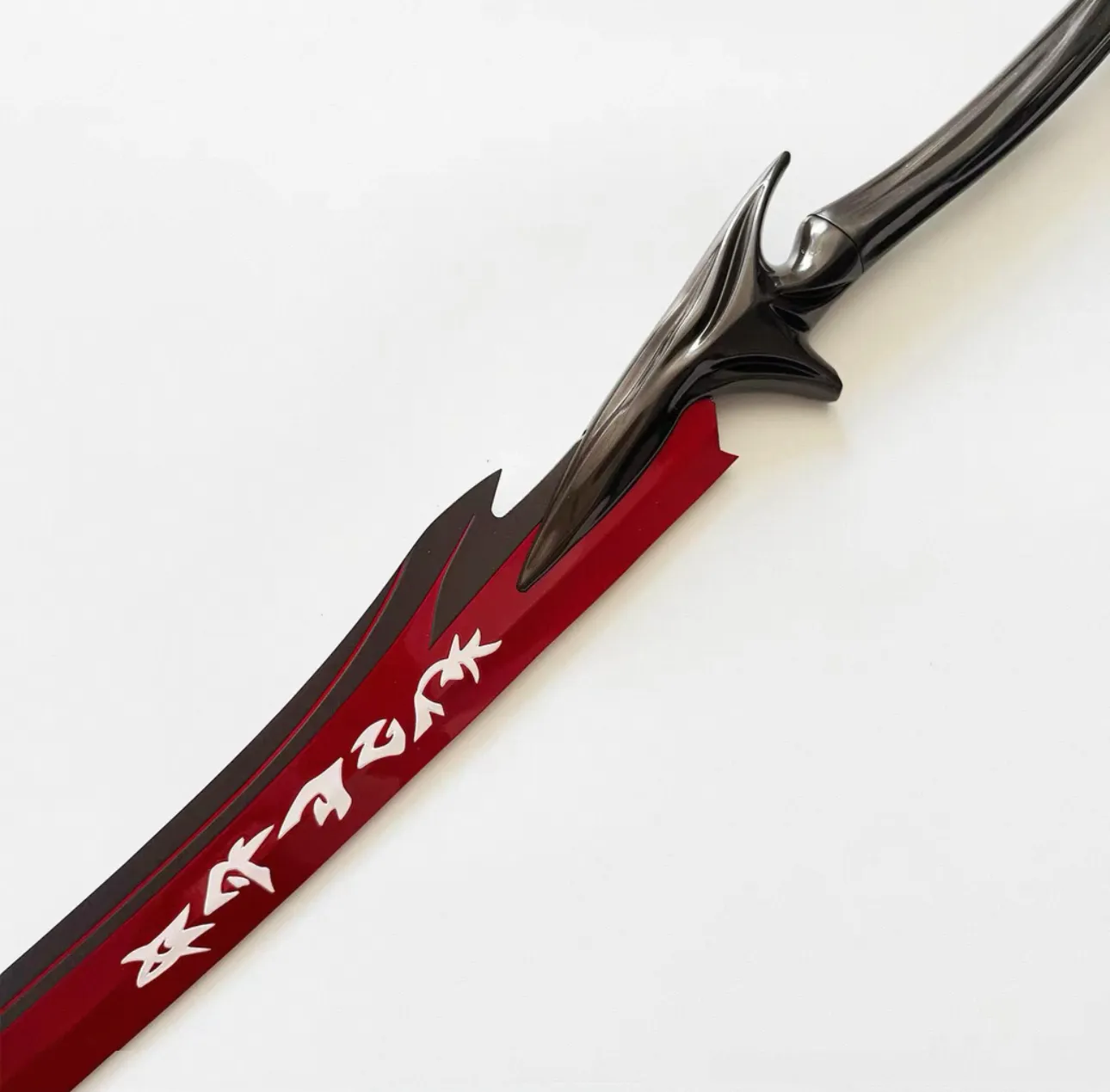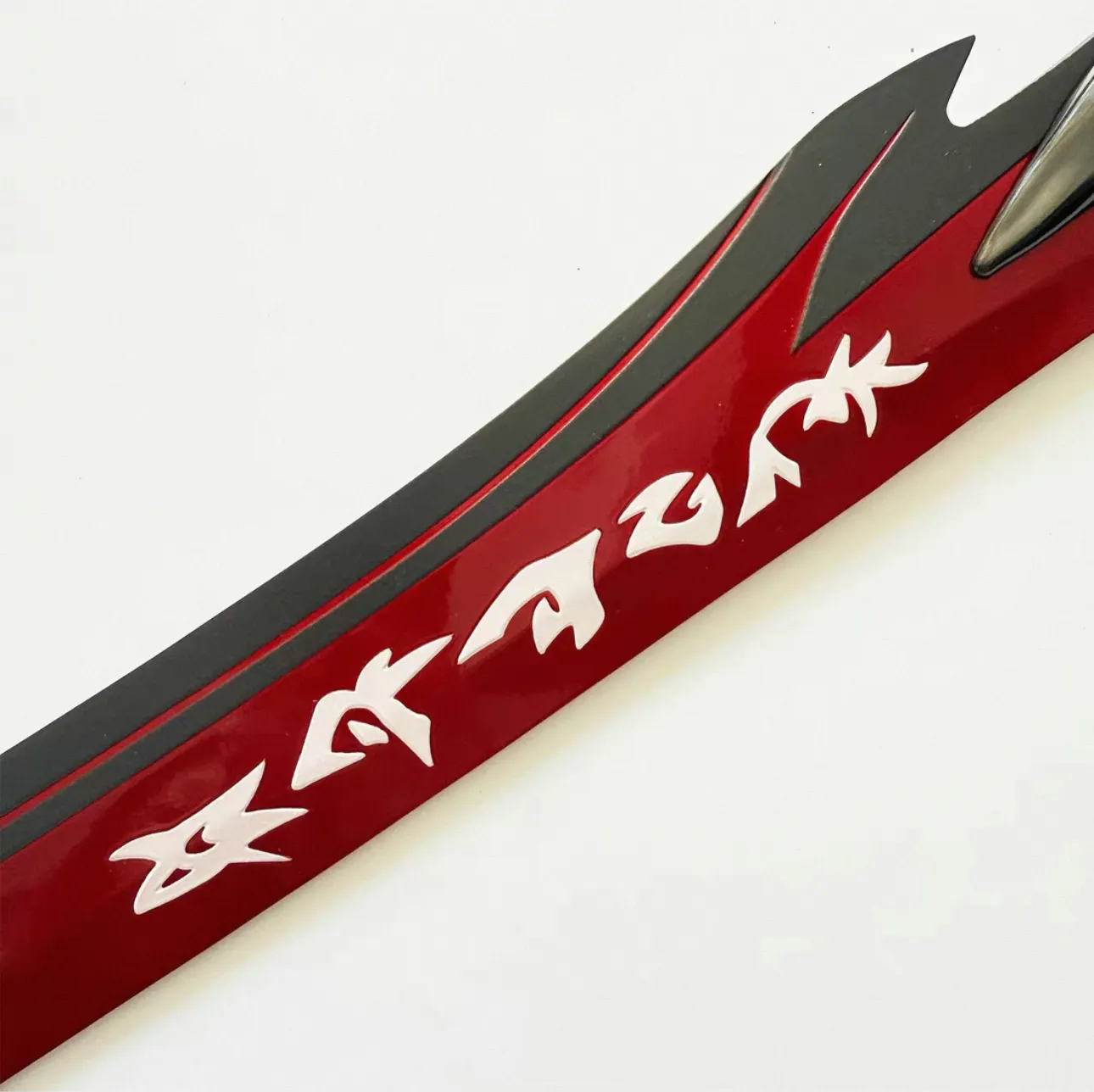 Lưỡi kiếm được rèn từ thép không gỉ, bề mặt hoàn thiện mịn, màu sắc đồng đều, giúp hạn chế oxy hóa và dễ bảo quản trong thời gian dài. Thiết kế lưỡi cách điệu với các đường cắt góc cạnh và ký tự trang trí đặc trưng, tái hiện rõ tinh thần vũ khí trong game. Thanh kiếm có kích thước lớn, trọng lượng vừa phải, đảm bảo sự cân đối khi trưng bày hoặc cầm nắm chụp hình.