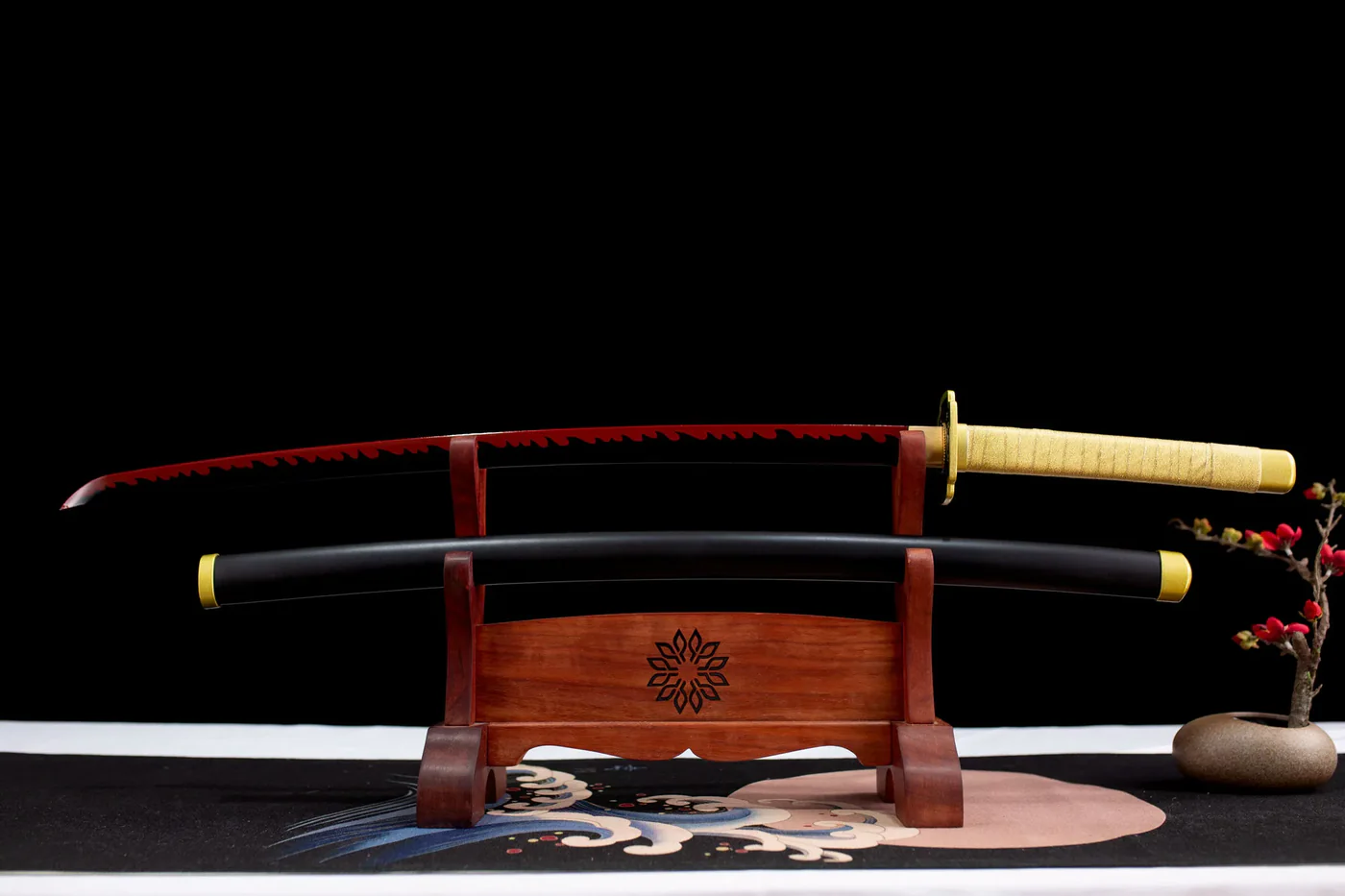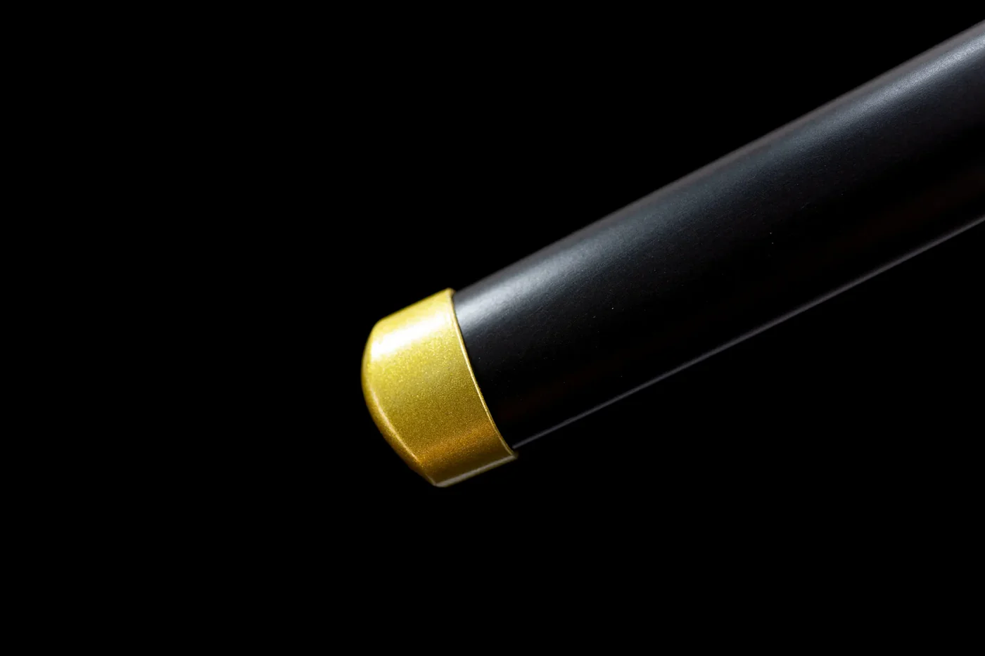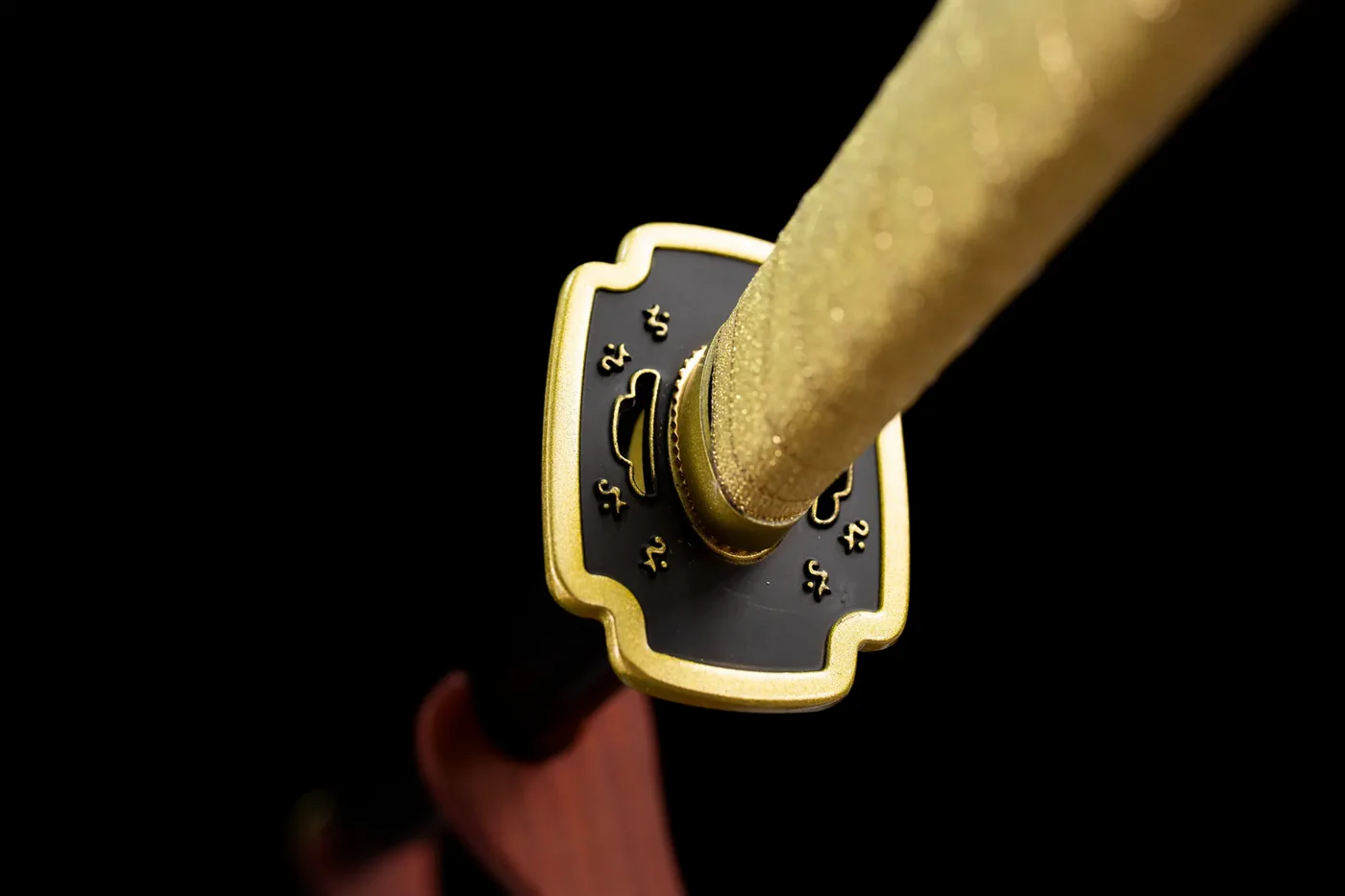 Lưỡi kiếm katana được chế tác từ thép carbon 1060, có độ cứng ổn định và khả năng giữ cạnh sắc tiêu chuẩn. Trên lưỡi phủ lớp sơn đen – đỏ nổi bật với họa tiết ngọn lửa đặc trưng, kèm ký tự kanji được khắc nổi bật ở phần thân gần habaki. Thiết kế kissaki (mũi kiếm) nhọn, đường nét chuẩn xác. Tsuba thiết kế hình chữ nhật bo góc với tông màu đen – viền vàng sang trọng, habaki màu vàng đồng chắc chắn, ôm khít phần lưỡi. Tsuka được bọc dây cotton màu vàng rực rỡ quấn gọn ghẽ, tạo độ bám tốt khi cầm. Phần kashira (nút chuôi) và fuchi (đai cổ chuôi) đồng bộ màu vàng, hài hòa cùng chắn tay tạo nên tổng thể cân đối. Saya(vỏ kiếm) gỗ phủ sơn đen mịn, hai đầu được bọc vàng nhấn nhá, giữ vẻ tối giản nhưng sang trọng, tương phản hoàn hảo với màu sắc rực rỡ của chuôi kiếm và họa tiết lưỡi của thanh katana. Yoriichi Tsugikuni Katana là lựa chọn lý tưởng để trưng bày sưu tầm, sử dụng trong cosplay hoặc làm đạo cụ nhiếp ảnh. Nền thép carbon 1060 cho phép thanh kiếm duy trì độ bền ổn định, thích hợp cho các bài tập nhẹ nhàng và thể hiện phong cách của người sở hữu.