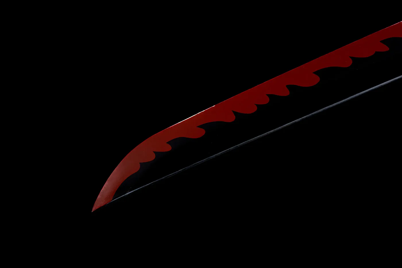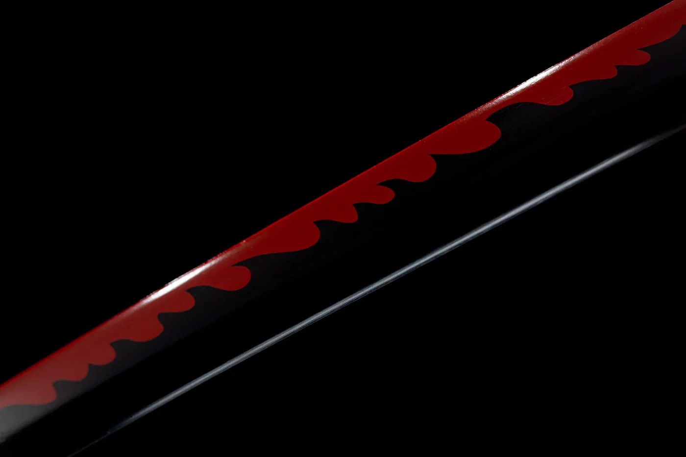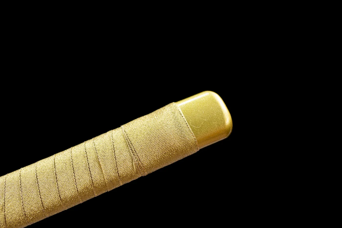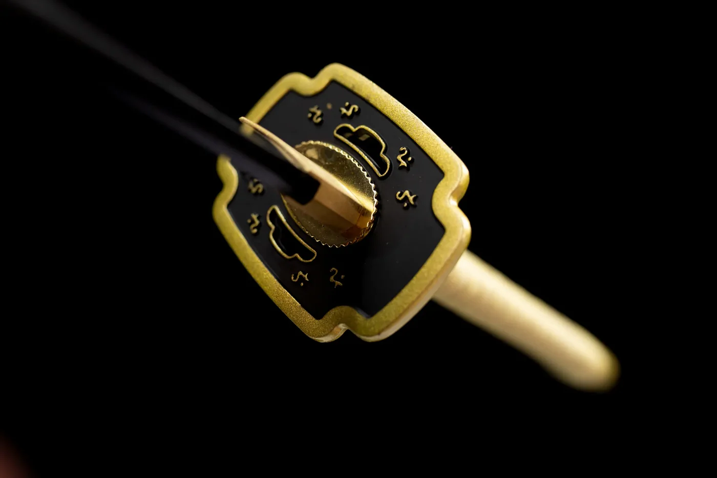 Lưỡi kiếm katana được chế tác từ thép carbon 1060, có độ cứng ổn định và khả năng giữ cạnh sắc tiêu chuẩn. Trên lưỡi phủ lớp sơn đen – đỏ nổi bật với họa tiết ngọn lửa đặc trưng, kèm ký tự kanji được khắc nổi bật ở phần thân gần habaki. Thiết kế kissaki (mũi kiếm) nhọn, đường nét chuẩn xác. Tsuba thiết kế hình chữ nhật bo góc với tông màu đen – viền vàng sang trọng, habaki màu vàng đồng chắc chắn, ôm khít phần lưỡi. Tsuka được bọc dây cotton màu vàng rực rỡ quấn gọn ghẽ, tạo độ bám tốt khi cầm. Phần kashira (nút chuôi) và fuchi (đai cổ chuôi) đồng bộ màu vàng, hài hòa cùng chắn tay tạo nên tổng thể cân đối. Saya(vỏ kiếm) gỗ phủ sơn đen mịn, hai đầu được bọc vàng nhấn nhá, giữ vẻ tối giản nhưng sang trọng, tương phản hoàn hảo với màu sắc rực rỡ của chuôi kiếm và họa tiết lưỡi của thanh katana. Yoriichi Tsugikuni Katana là lựa chọn lý tưởng để trưng bày sưu tầm, sử dụng trong cosplay hoặc làm đạo cụ nhiếp ảnh. Nền thép carbon 1060 cho phép thanh kiếm duy trì độ bền ổn định, thích hợp cho các bài tập nhẹ nhàng và thể hiện phong cách của người sở hữu.