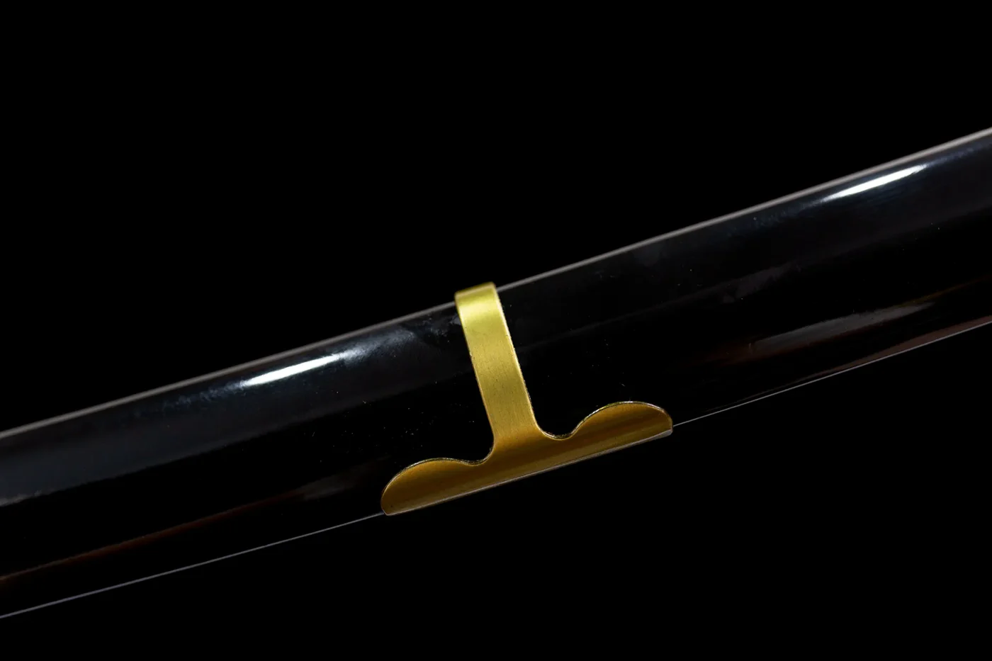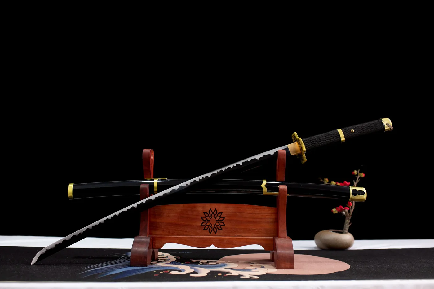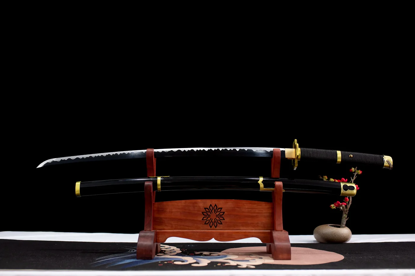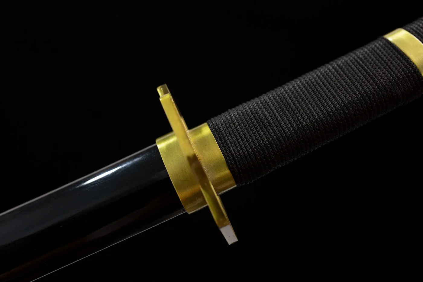 Được lấy cảm hứng và tạo ra phiên bản phục dựng Yubashiri Katana tái hiện hình ảnh thanh kiếm nổi tiếng từng được Zoro sử dụng trong bộ truyện One Piece. Lưỡi kiếm katana được rèn từ thép carbon 1060, nổi bật với độ cong chuẩn mực và đường hamon giả sắc nét chạy dọc sống lưỡi, tạo nên hiệu ứng thị giác đầy chiều sâu. Lưỡi có độ dày và cân bằng tốt. Tsuba (chắn tay) thiết kế dạng thập tự viền vàng đồng trên nền đen nhám, chạm khắc hoa văn đặc trưng của Yubashiri, tạo điểm nhấn mạnh mẽ và dễ nhận diện. Tsuka (chuôi kiếm) được quấn dây đen trơn gọn gàng, chắc chắn, kết hợp với lớp samegawa (giả da cá đuối) ẩn bên dưới. Fuchi, kashira và habaki bằng hợp kim xi vàng đồng, đồng bộ với chắn tay(tsuba) để tạo nên tổng thể sắc nét và hài hòa. Saya (vỏ kiếm) phủ lớp sơn mài đen bóng, kết hợp các khớp nối kim loại màu vàng đồng được gia công tinh xảo, giúp tăng tính thẩm mỹ và độ bền. Yubashiri Katana là thanh katana cho những người yêu thích One Piece, phù hợp để tập luyện nhẹ nhàng, sưu tầm, trưng bày, cosplay hoặc sử dụng như đạo cụ nhiếp ảnh.